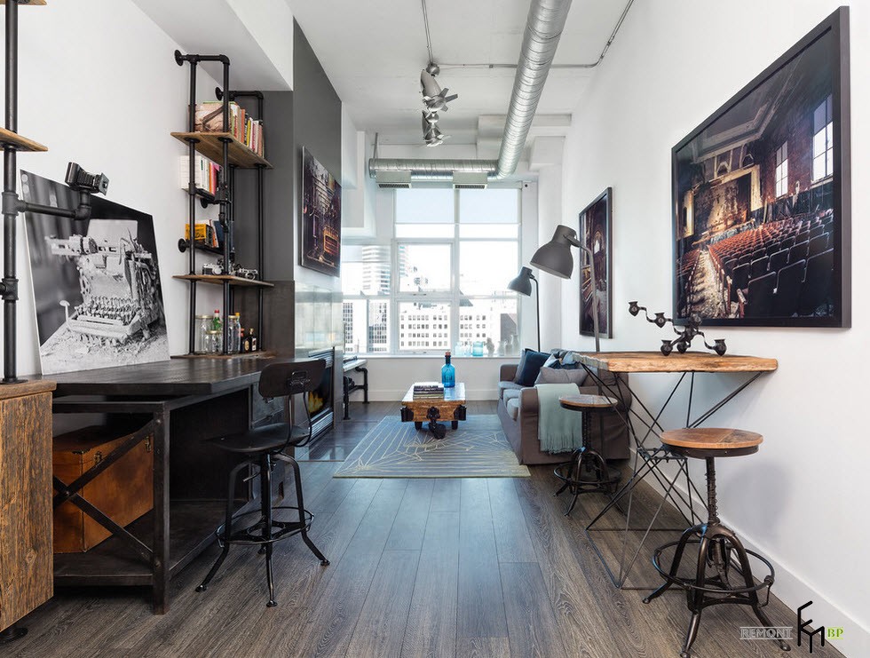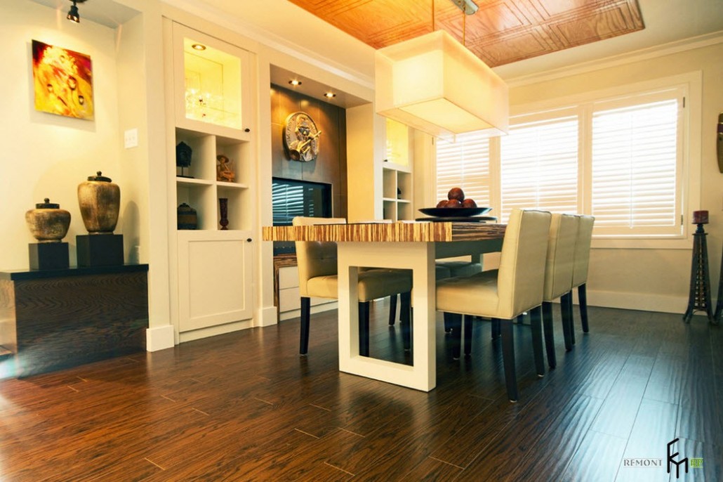 «Деревянный» ламинат прекрасно смотрится с оголенными потолочными балками. Кантри – стиль требует использования деревянных напольных покрытий, а при недостатке средств ламинат станет спасением. Помещения, стилизованные под охотничьи или рыбацкие домики, будут выглядеть законченными, если на полу будет лежать качественная имитация темной напольной доски. В этом интерьере камин и шкура медведя на полу будет смотреться особенно органично.