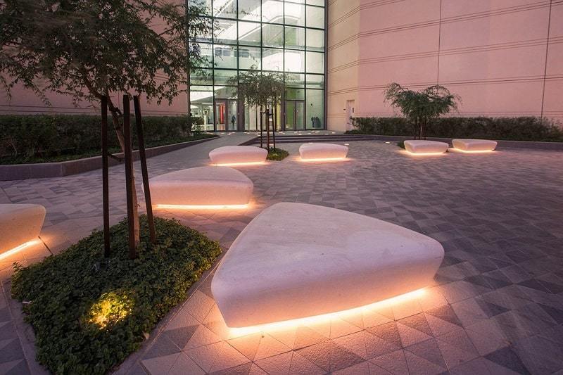 - Такое освещение поможет подчеркнуть определенные особенности придомовой территории, выгодно подчеркнет скамейки, фонтаны, другие арт-объекты и те места, которые хочется выделить.