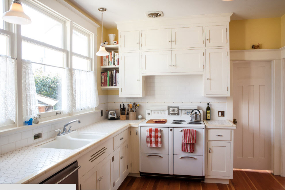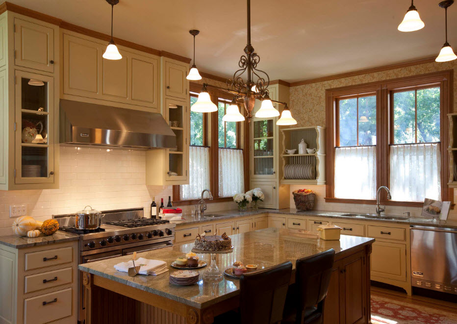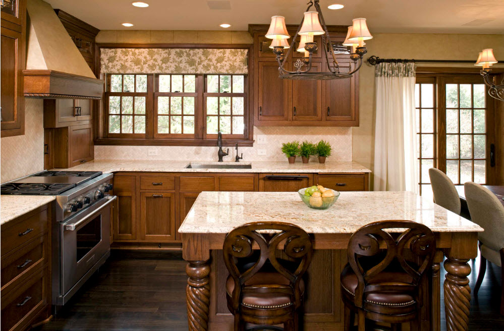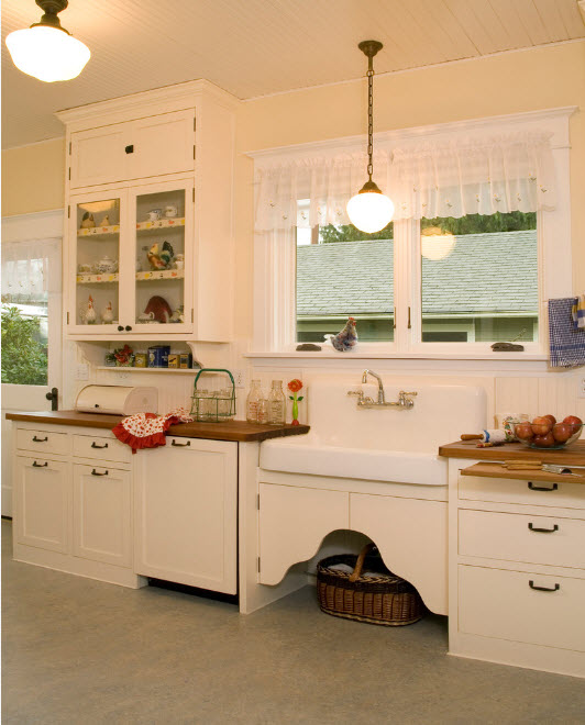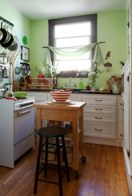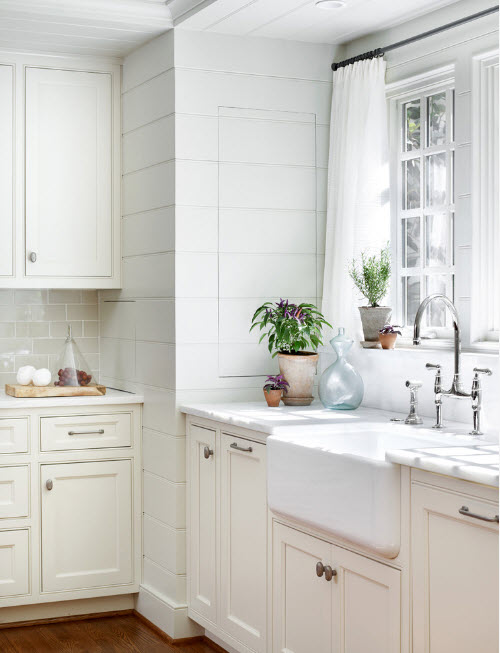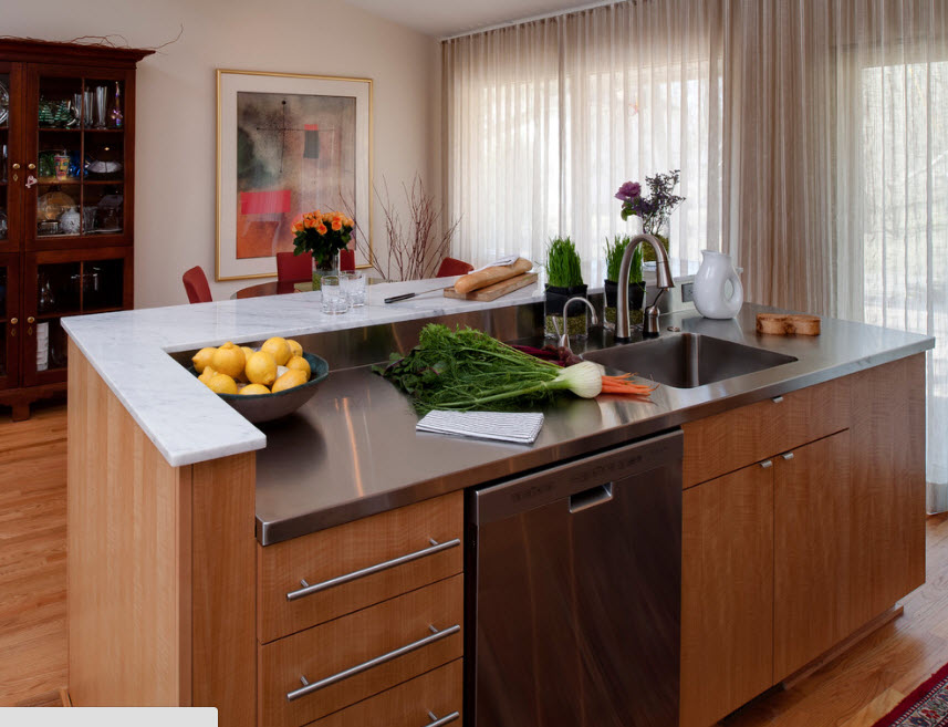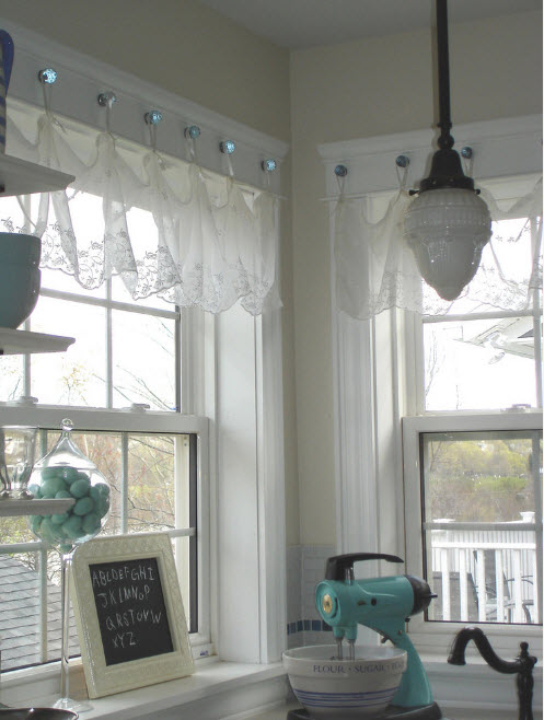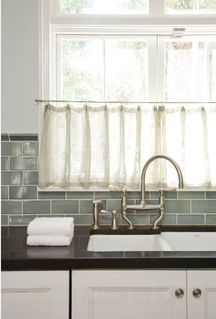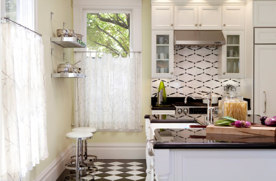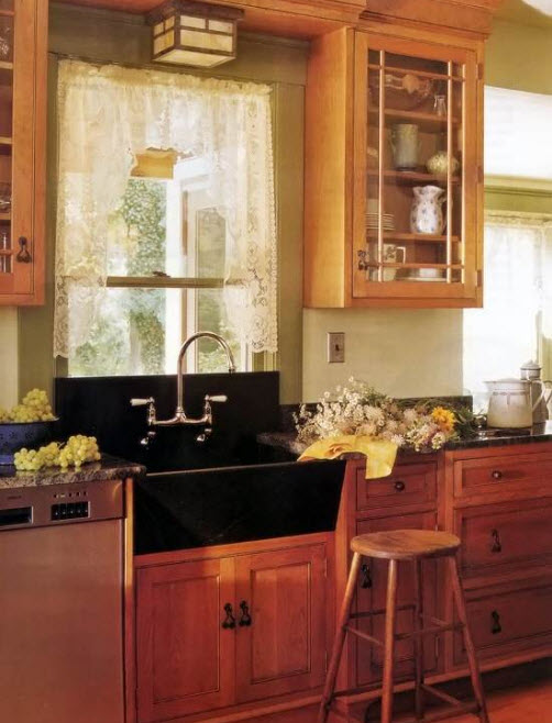 Раковина для мытья посуды у окна – мечта хозяйки. Как приятно отвлекаться от рутинной работы на красивый пейзаж или следить за детьми, играющими возле дома. Но кухонное окно, выходящее на улицу – это повод для того, чтобы скрыть происходящее внутри дома, по крайней мере, частично. Небольшие тюлевые занавески, занимающие треть или половину высоты оконного проема не будут препятствовать проникновению солнечного света, но происходящее в комнате от посторонних глаз скроют.
