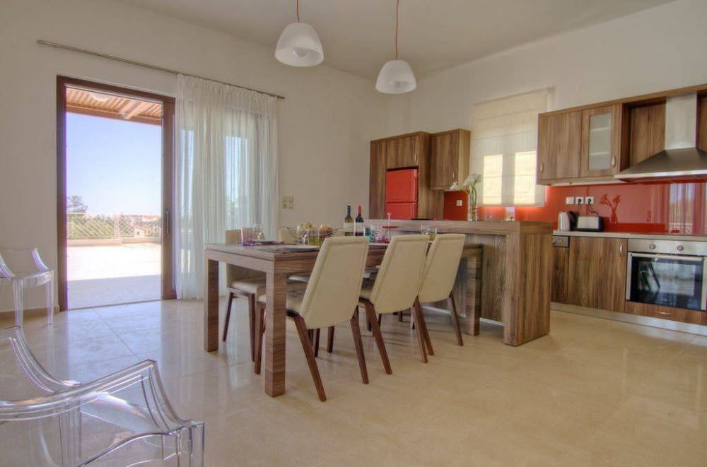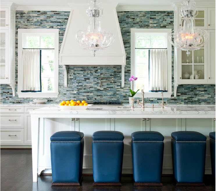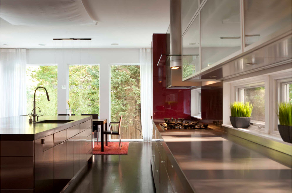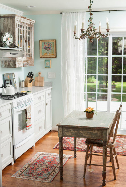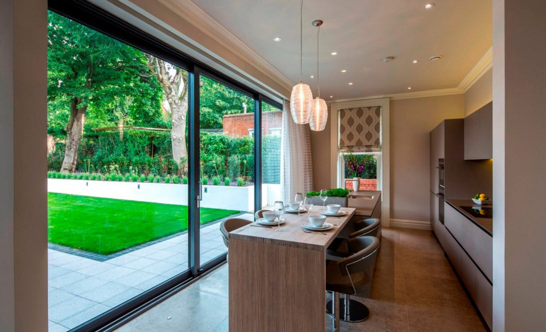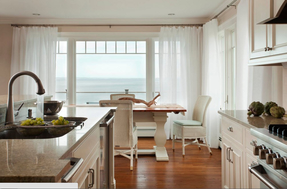 В кухонных пространствах, имеющих выход на террасу или задний двор с помощью стеклянных дверей, прозрачные ткани можно использовать не только по прямому назначению. Помимо частичной защиты помещения от солнечных лучей и посторонних глаз за пределами жилища, тюль можно использовать в качестве барьера для проникновения насекомых, когда хозяева теплым вечером решают поужинать практически на свежем воздухе и настежь открывают раздвижные стеклянные двери.
