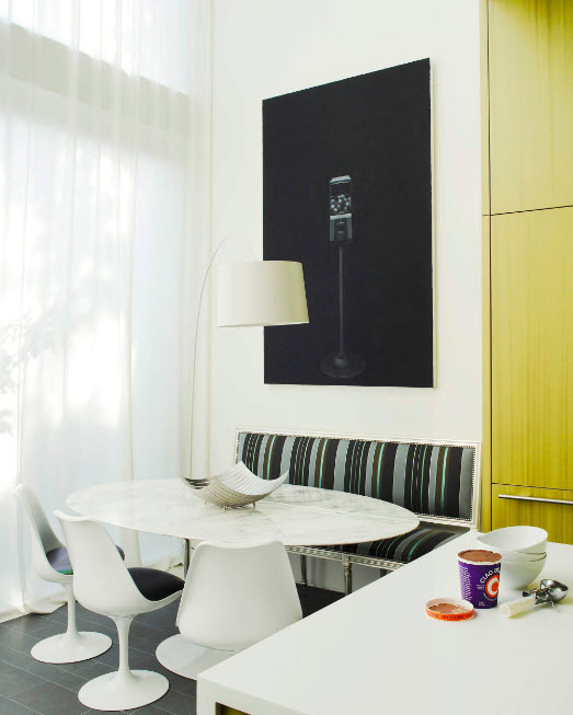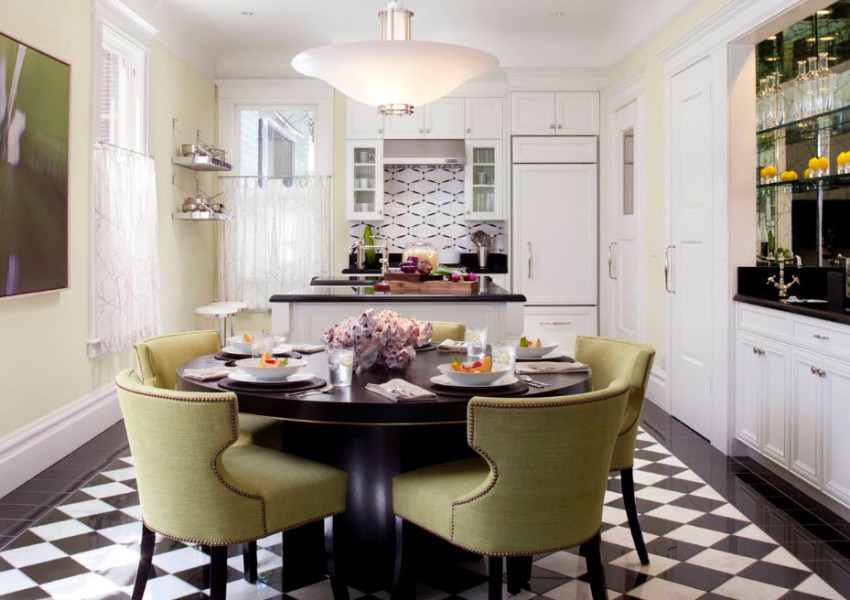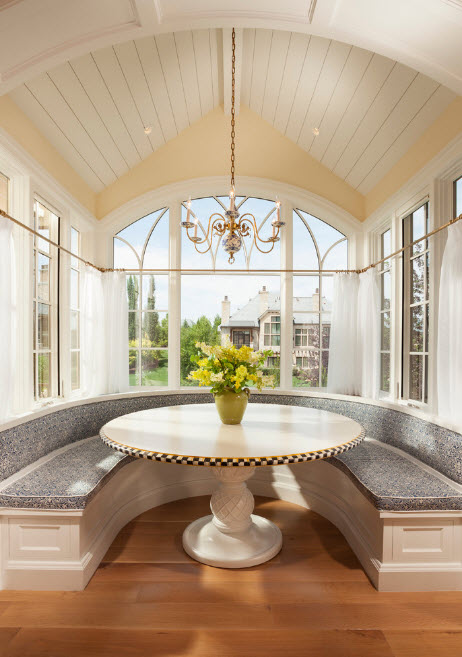 Если обеденная зона вашей кухни-столовой находится в эркере, то использование драпировки для больших окон будет непросто украшением функционального сегмента, но и защитой от солнечных лучей во время утренних трапез или полуденных обедов (в зависимости от расположения кухни по отношению к сторонам света).