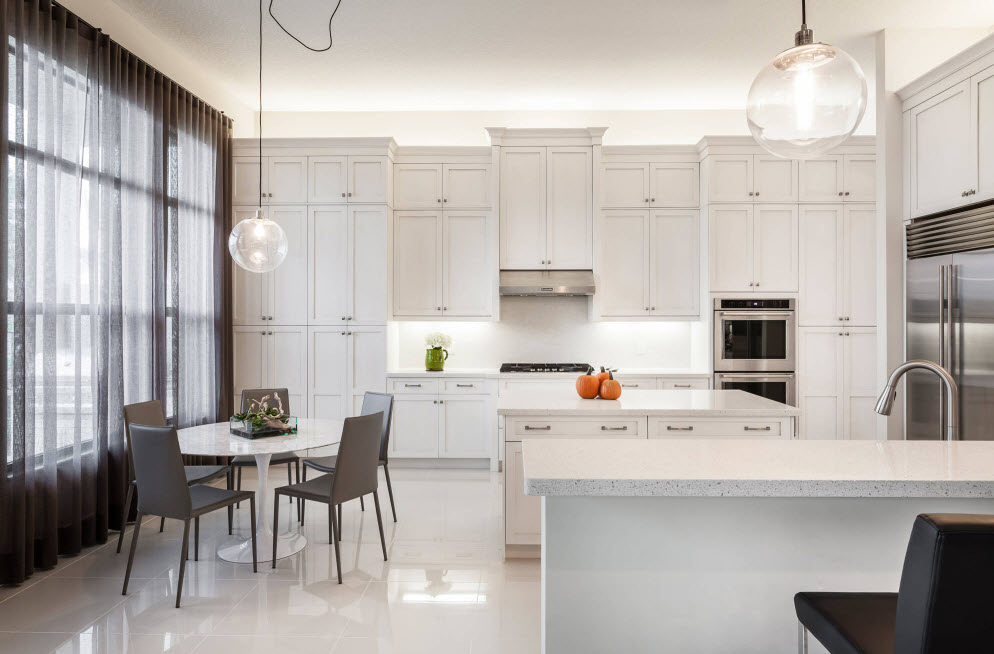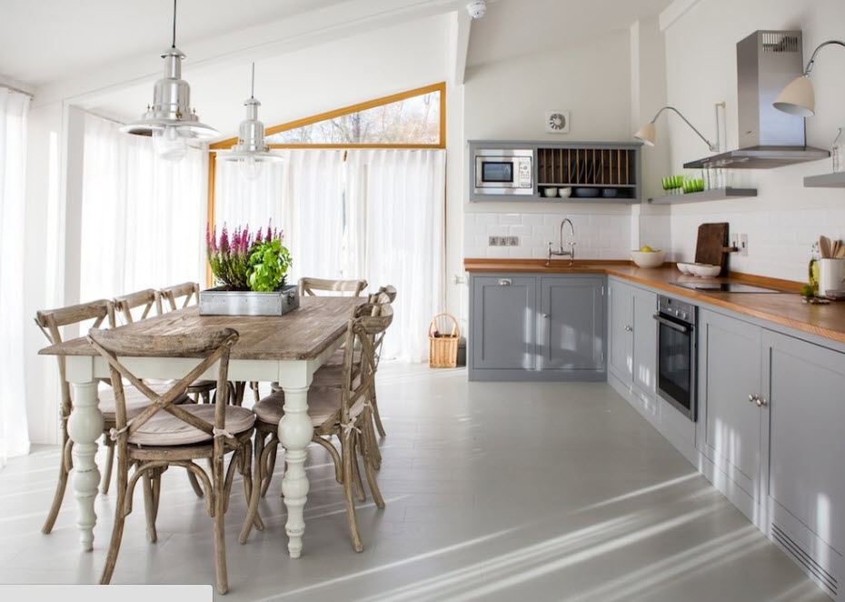 Просторная кухня-столовая с панорамным окном нуждается в драпировке. Полупрозрачный тюль может стать эффектным дополнением к интерьеру многофункционального помещения – подчеркнет легкость образа или создаст акцент – все зависит от выбора цветовой палитры. Безусловно, белоснежный тюль – фаворит для оформления комнат с самой разнообразной функциональной нагрузкой и кухонное помещение не становится исключением. Но и гладкие ткани с легким, ненавязчивым принтом (чаще всего растительным или геометрическим) способны органично вписаться в созданный дизайн кухонного пространства, соединенного со столовой, а иногда и с гостиной.