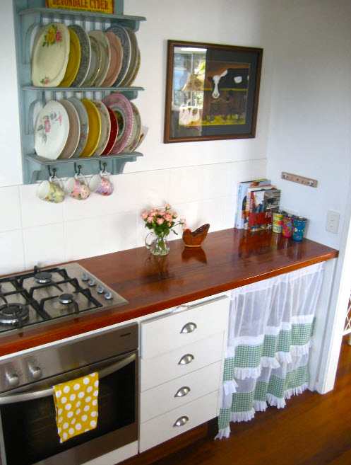 Еще один способ использования текстиля применительно к кухонным фасадам – замена дверей шкафчиков нижнего яруса на полупрозрачные занавески. Для некоторых хозяек проще периодически стирать небольшую шторку, чем очищать дверцы шкафчика, внутри которого находится мусорное ведро, например, а значит, место это в кухонном пространстве используется очень часто.