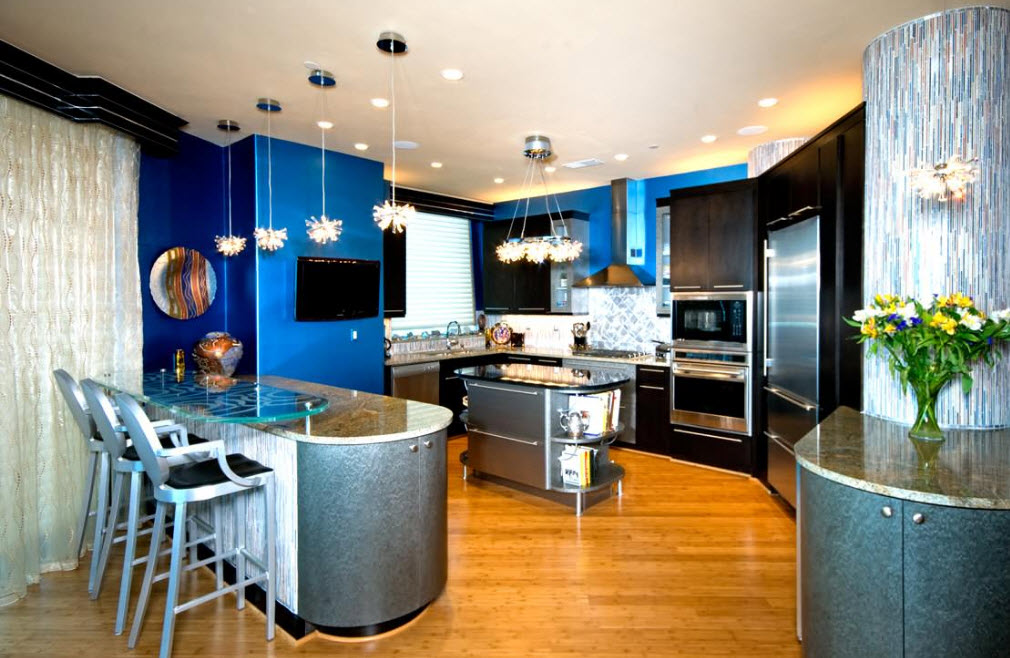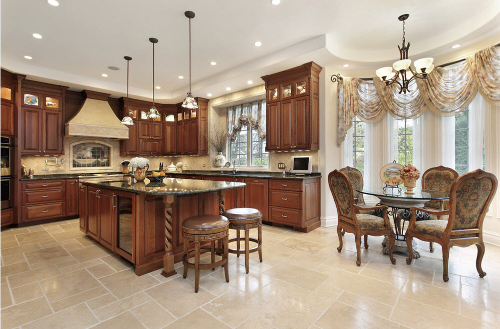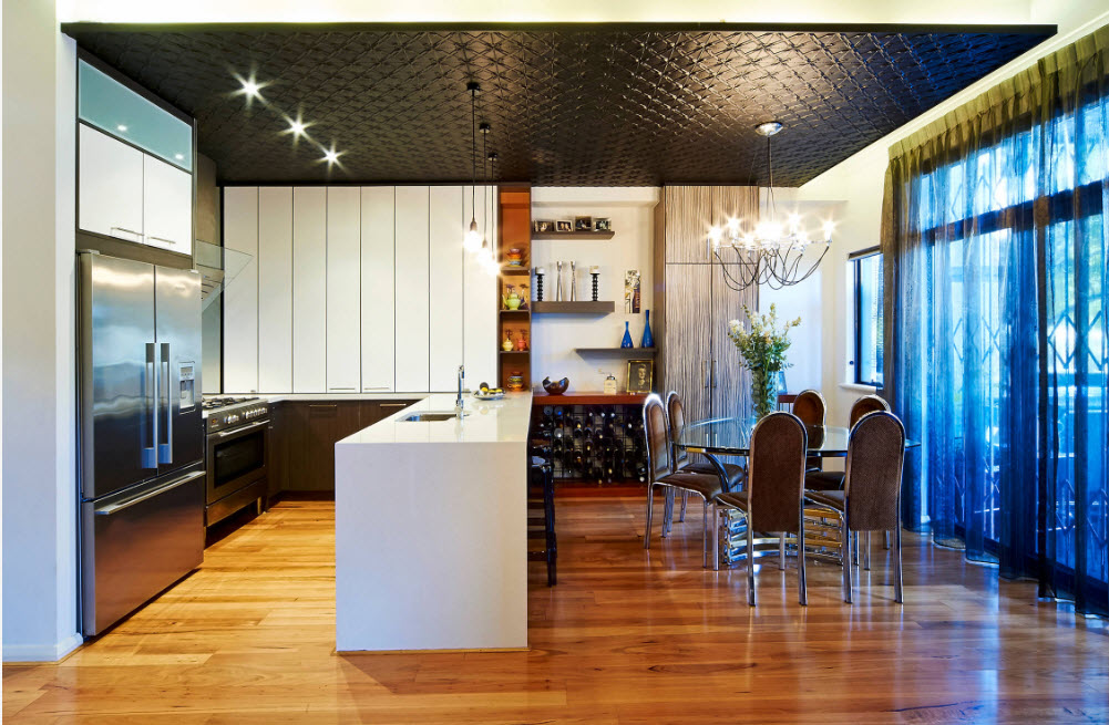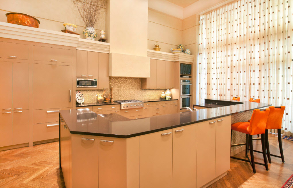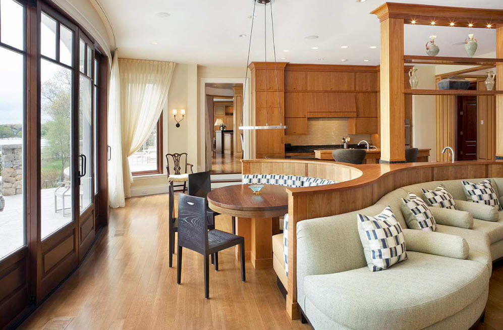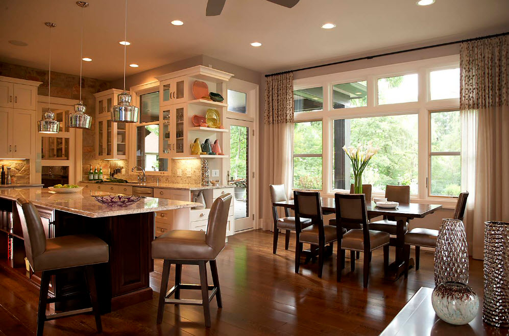 Если в просторном помещении кухни, совмещенной со столовой, используются окна различной модификации, то они нуждаются в индивидуальном подходе к обеспечению драпировкой. Например, окна, расположенные над столешницами нижнего яруса шкафов, можно оформить с помощью тюлевых жалюзи или на манер японских штор-экранов. А для больших панорамных окон или стеклянных дверей можно использовать классический вид полупрозрачных занавесок.