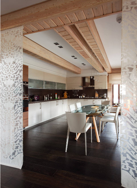 Оригинально будут смотреться тюлевые экраны, созданные по принципу японских штор. Четкая форма придает некоторой строгости и геометричности помещению, но при этом витиеватые узоры на тюле, растительный или абстрактный рисунок привносит нотки романтичности, легкости и свежести в созданный образ кухни, совмещенной со столовой.