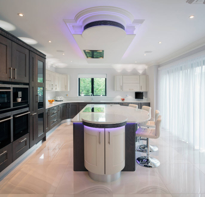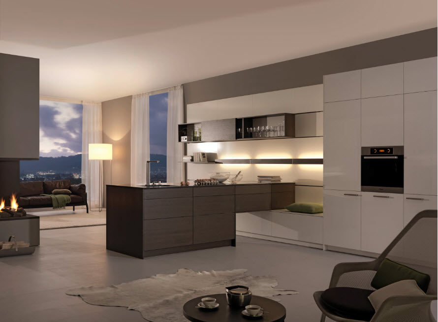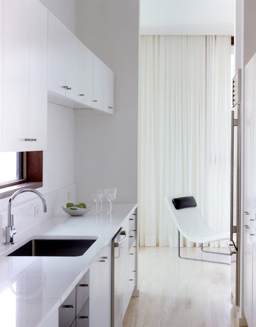 Темный тюль может стать цветовым акцентом в абсолютно светлой кухне. На фоне белоснежной отделки и светлых кухонных фасадов, темный текстиль будет выглядеть эффектно, привлекать внимание к большим окнам и визуально «вытягивать» помещение в высоту, если расположить карнизы под самым потолком.