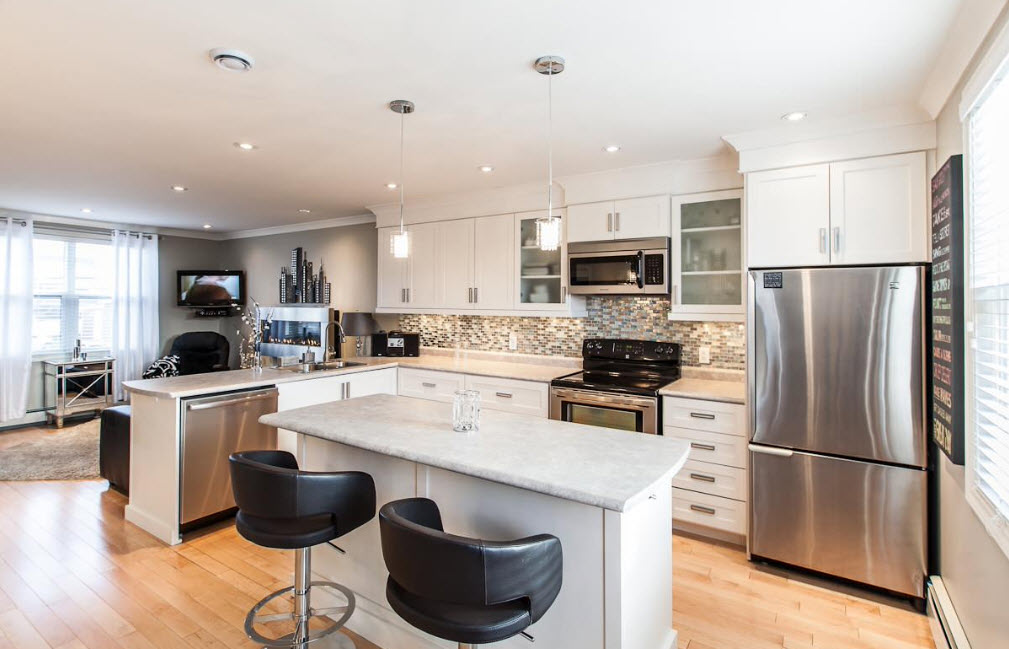В просторном помещении, выполняющем функции гостиной, столовой и кухни, как правило, используется принцип открытой планировки. При таком подходе отделка всех функциональных сегмент чаще всего имеет идентичное исполнение. Еще одним объединяющим фактором для всех зон может стать драпировка нескольких окон единым выбором текстиля. Белоснежный гладкий тюль станет отличным выбором, органично выписывающимся в любой стиль оформления пространства.
