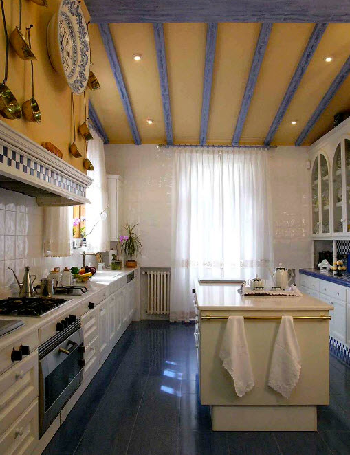 Традиционное использование тюля в кухонном пространстве – драпировка окон. Размещая текстиль от самого потолка (используя потолочные карнизы) до пола, можно не только снизить уровень естественной освещенности помещения в солнечный день, но и визуально увеличить высоту комнаты. Помимо всего прочего, тонкие, прозрачные ткани на окнах придают всему интерьеру кухни легкости, воздушности, некоторой романтичности.