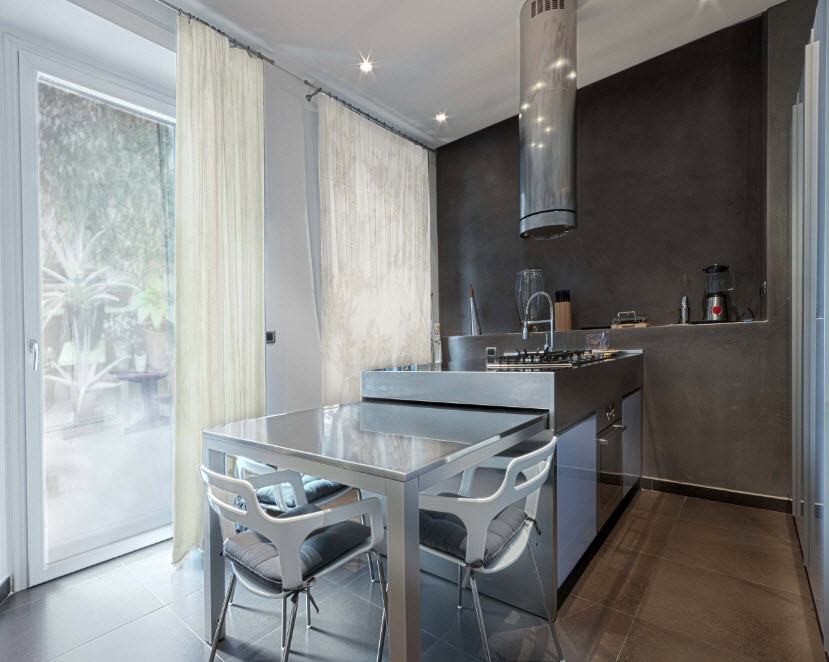 Многие из нас не представляют другого цвета для исполнения тюля, кроме белоснежного. Многие хозяйки бы согласились на использование светлых, пастельных оттенков для оформления окон в кухонном пространстве. А как насчет темных тонов серого, шоколадного или даже черного цвета? Перед вами пример совмещенного помещения с отделкой «под кирпичную стену» и применением темно-серых занавесок для драпировки оконных проемов. Легкий налет драматичности к лицу этому лофт-пространству.