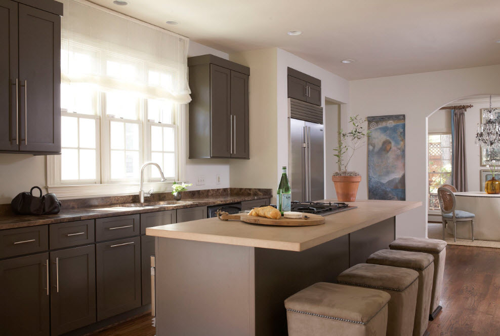 Не меньшей популярностью пользуются полупрозрачные ткани для оформления кухонных окон всех оттенков коричневого цвета – от светло-бежевого до «темного шоколада». Теплота цветовой палитры привносит уют и умиротворение в атмосферу помещения.