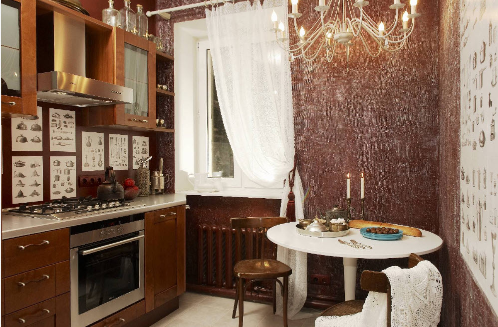 В некоторых случаях использование кружевного тюля для оформления оконных проемов кухни связано исключительно с декорированием. Например, коротенькие занавески с вышитыми или выбитыми кружевами в нижней части, которые не способны защитить помещение от солнечных лучей, выступают в качестве декоративного элемента. Именно от таких деталей образ помещения становится более уютным, притягательным, более домашним.