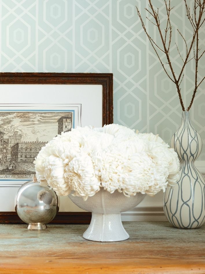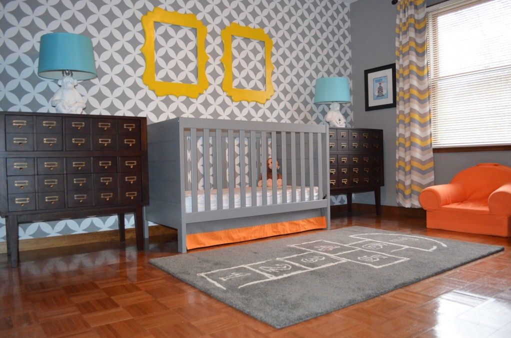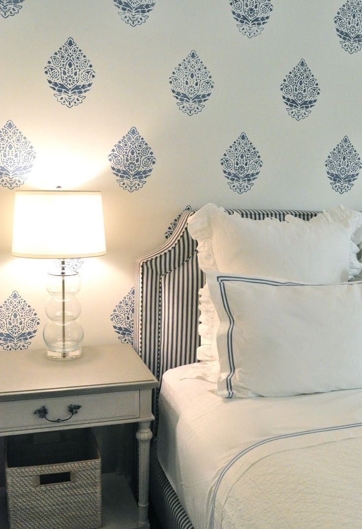 Трафаретом можно обыграть розетки, выключатели, какие-то полки или шкаф. В последнем случае будет интересно нанести над мебелью от предмета, который теоретически должен или может там стоять, это создаст интересный эффект.