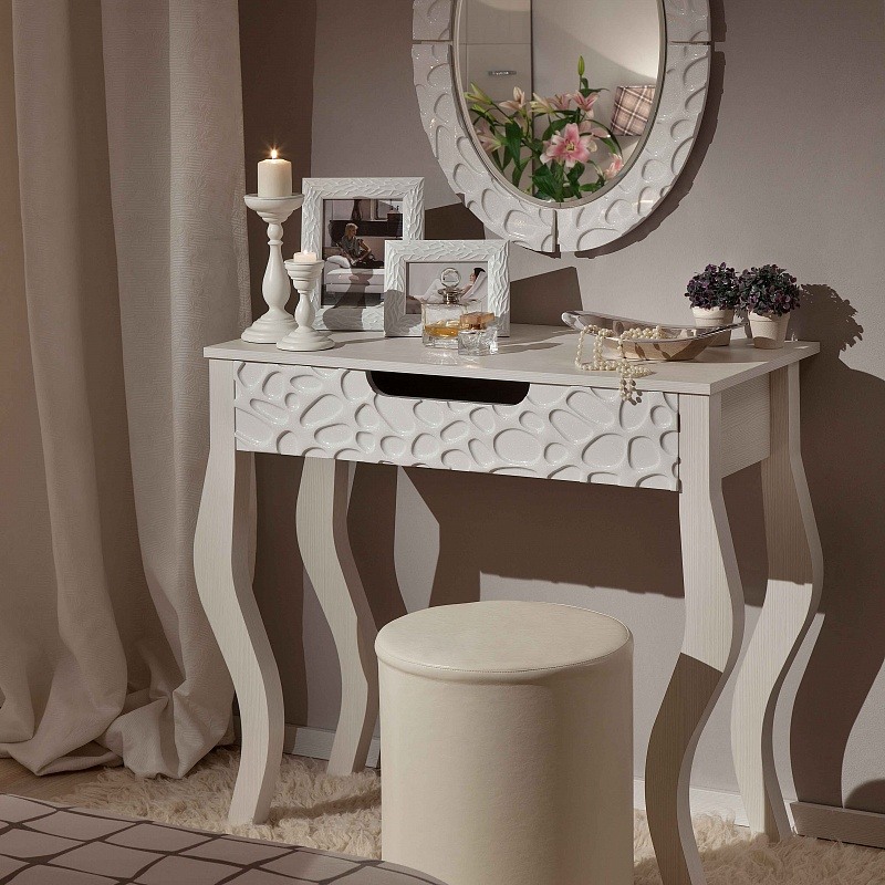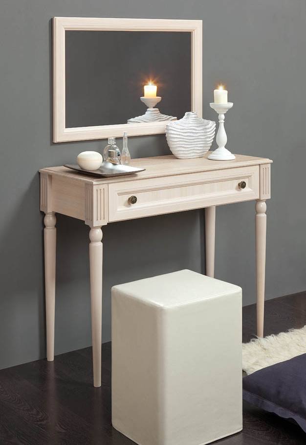 В последние сезоны особенно популярны зеркальные туалетные столики. Чаще всего они изготавливаются из светлого дерева или лакированных панелей ПВХ. Интересным предложением также является туалетный столик в форме консоли, верх и сиденье которого обтянуты экологической кожей. Кроме того, модели с зеркалом в стиле гламур выглядят потрясающе, где верх выполнен из стекла, а рама — из декоративного хромированного формованного металла. Покупателей чаще всего интересуют вечные модели, которые никогда не выходят из моды.