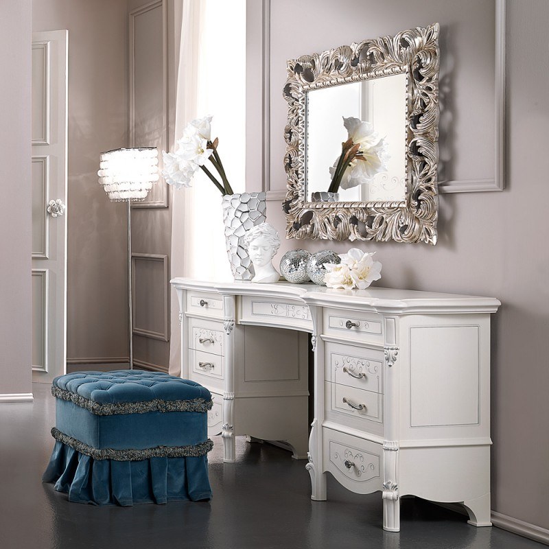 Для некоторых предпочтительным вариантом является туалетный столик без зеркал, более похожий на письменный стол. Большинство, однако, определенно выбирают классическую форму этой мебели, а значит, красивый и стильный туалетный столик, который благодаря своей исключительной привлекательности и уникальному стилю, выраженному в декорированном и красиво отделанном зеркале, придает интерьеру необычайную эстетику.