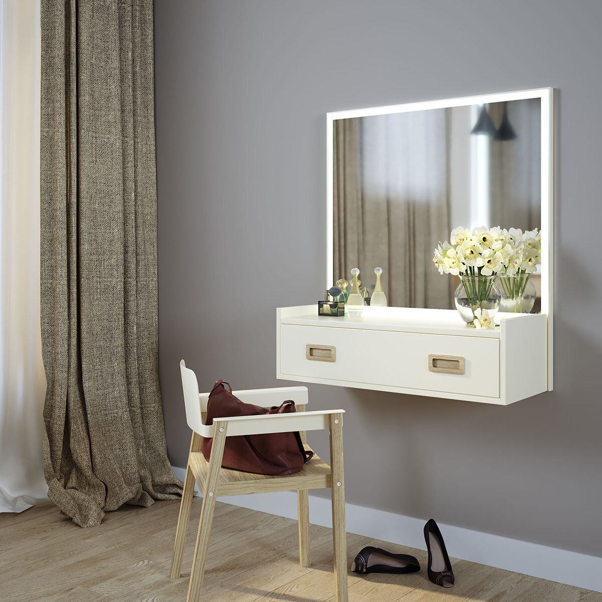 Современные туалетные столики с зеркалом характеризуются простой формой конструкции, а также однородным, нейтральным цветом. Часто на отражающей поверхности устанавливают дополнительное освещение. Интересным решением также являются туалетные столики, зеркала которых складываются внутрь.