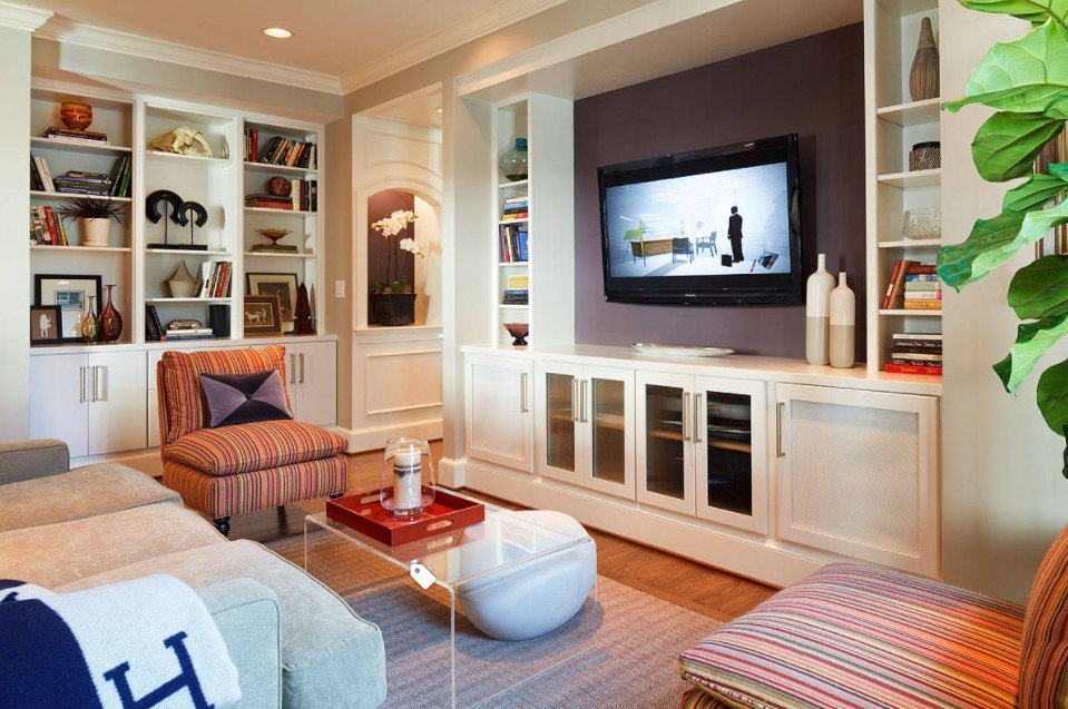 Встроенный тип тумб под телевизор располагается в нише стены и зачастую не имеет никаких лишних деталей, кроме подсветки. Такая конструкция нуждается в сложном монтаже, но, как и предыдущее предложение позволяет сэкономить пространство.