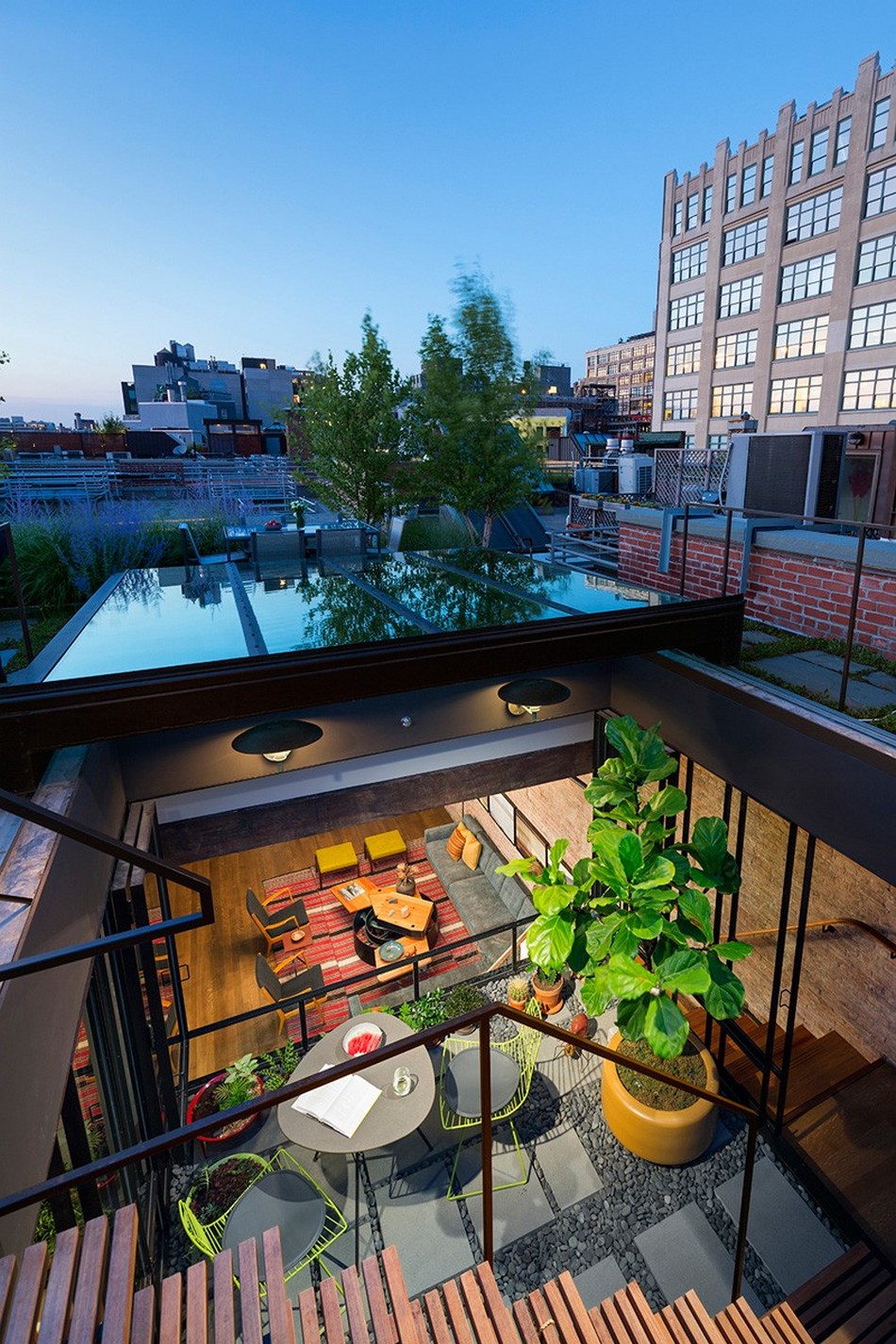 Ля того чтобы попасть на второй, а затем и третий уровень нью-йоркской квартиры, необходимо подняться по лестнице с металлическим каркасом и деревянными ступенями. И мы оказываемся в настоящем саду, но только находящимся высоко над землей и являющимся частью многоквартирного дома. Что может быть лучше чувства близости к природе посреди шумного и многолюдного мегаполиса?