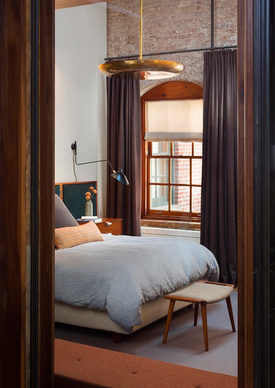 Стиль лофт ратует за максимально просторные и открытые пространства. В квартирах и домах, оформленных в этой стилистике, часто даже спальная зона оказывается частью общего большого помещения. Но в нью-йоркской квартире спальни получили свою долю приватности, хоть и находятся на виду, если наблюдать за комнатами через межкомнатную перегородку со стеклянными вставками.