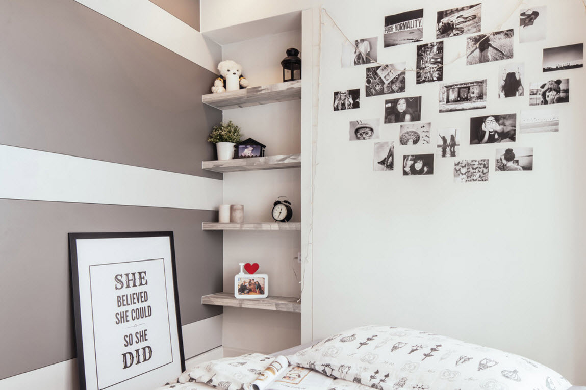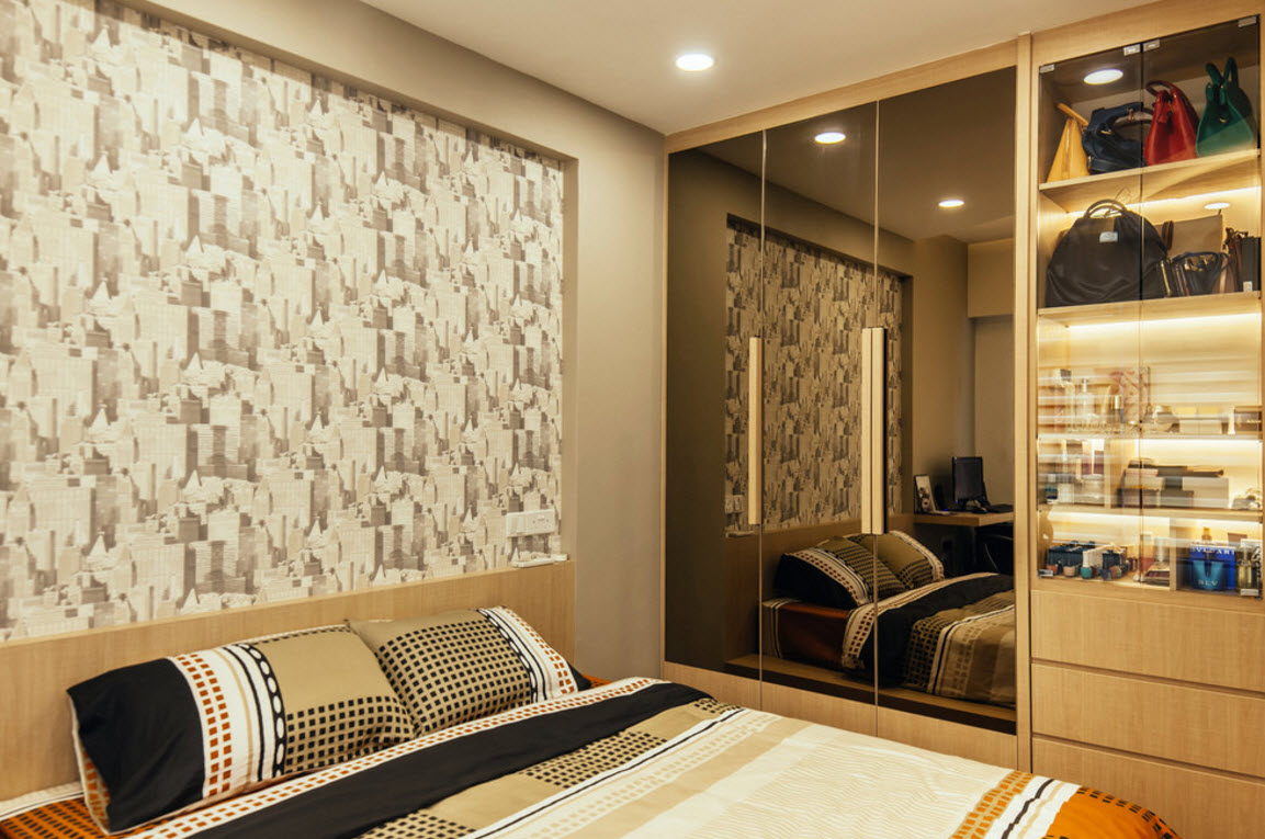 Помещение спальни, так же как и остальные комнаты, не может похвастать большой площадью. Поэтому для оформления спального пространства были выбраны преимущественно светлые тона, способные визуально расширить комнату.