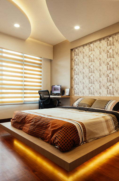 В интерьере главной спальни от морского стиля осталось лишь использование песочного цвета и применение натуральной древесины. А вот от высокотехнологичной стилистике интерьеру спального помещения «достались» простые и лаконичные формы, строгие линии и практичные решения. С помощью встроенной подсветки даже самое простое и непритязательное в оформлении помещение становится интересным, оригинальным, разноплановым – кровать будто парит над полом, а над спальным местом кажется раздвигаются створки некой конструкции, из которой так и льется теплое освещение.