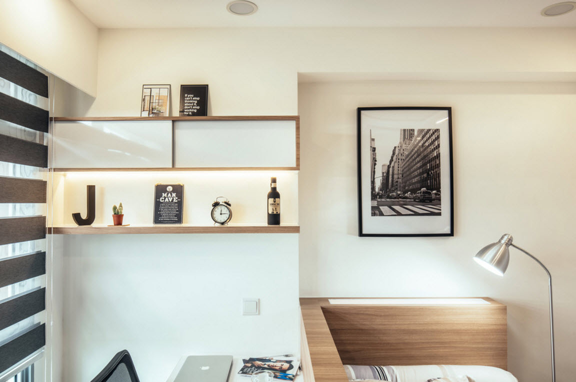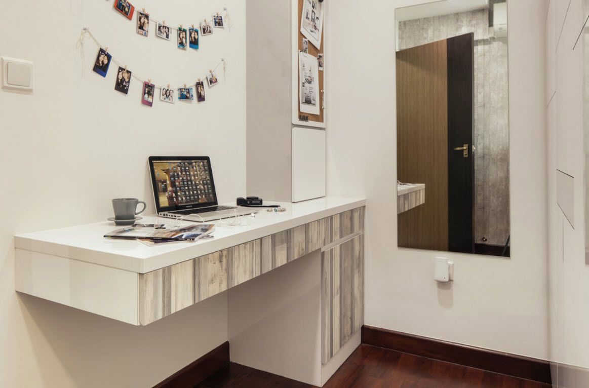 За межкомнатной перегородкой, изолированно от спального места находится небольшой кабинет. Для того, чтобы обустроить небольшой домашний офис необходимо совсем немного места – встроенная мебель консольного типа и светлые тона исполнения позволили создать уютное, но при этом функциональное рабочее место.