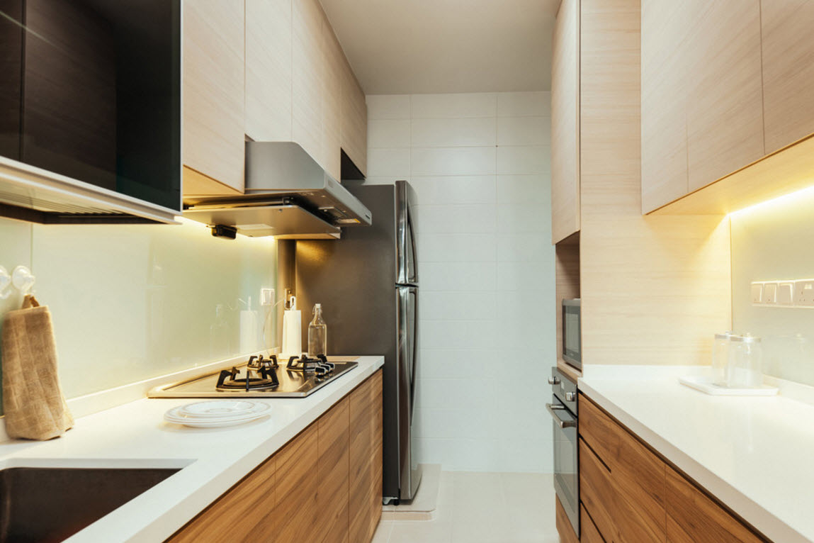 В небольшой квартире под кухонное помещение было отведено меньше всего места. Узкая, но достаточно длинная комната просто неспособна была вместить и рабочую, и обеденную зону. Поэтому при планировке кухонного пространства упор был сделан на размещение максимально возможного количества систем хранения, рабочих поверхностей и бытовой техники на небольшой площади. Идеальным вариантом стала параллельная планировка кухонного гарнитура.