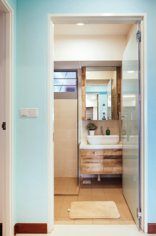 Сочетание «теплоты» и «прохлады» в дизайне утилитарного помещения позволило создать благоприятную атмосферу без особых затрат – бежевые оттенки исполнены в глянцевых поверхностях, матовые вставки из натурального дерева привносят самобытные нотки в характер интерьера.