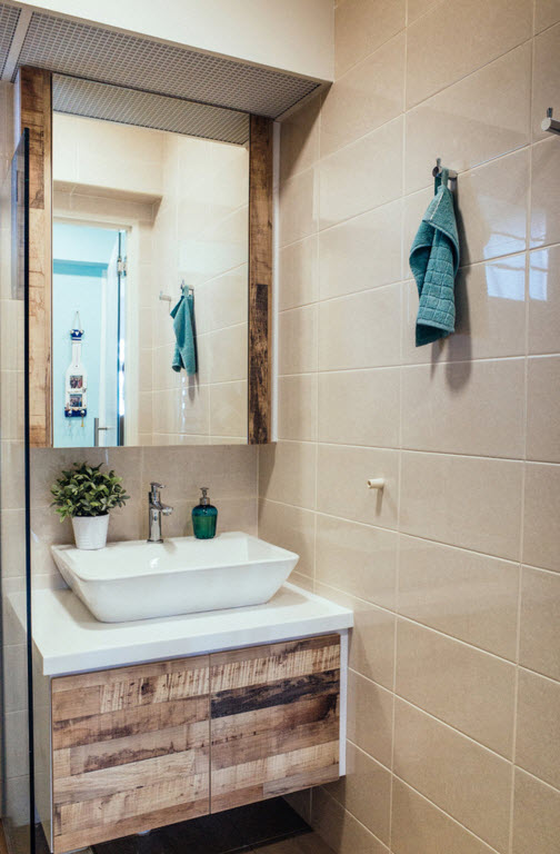В интерьер ванной комнаты были использованы те же теплые природные оттенки в сочетании с прохладой зеркальных и стеклянных поверхностей. В небольшом пространстве удалось разместить всю необходимую сантехнику и системы хранения благодаря практичной и эргономичной компоновке.