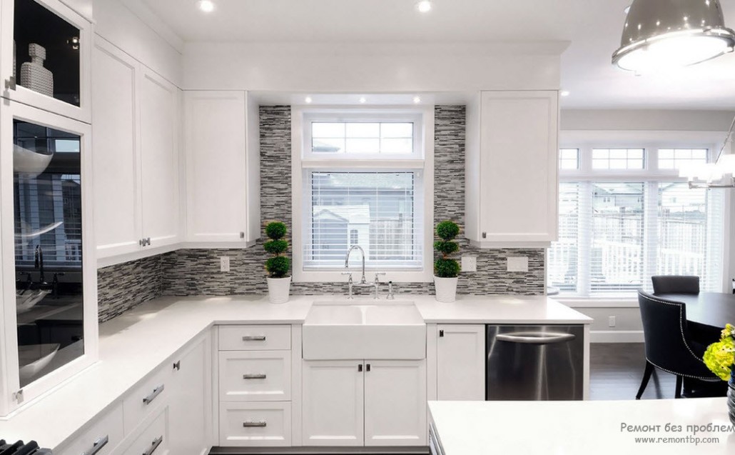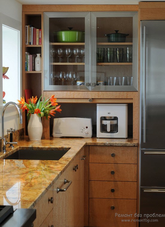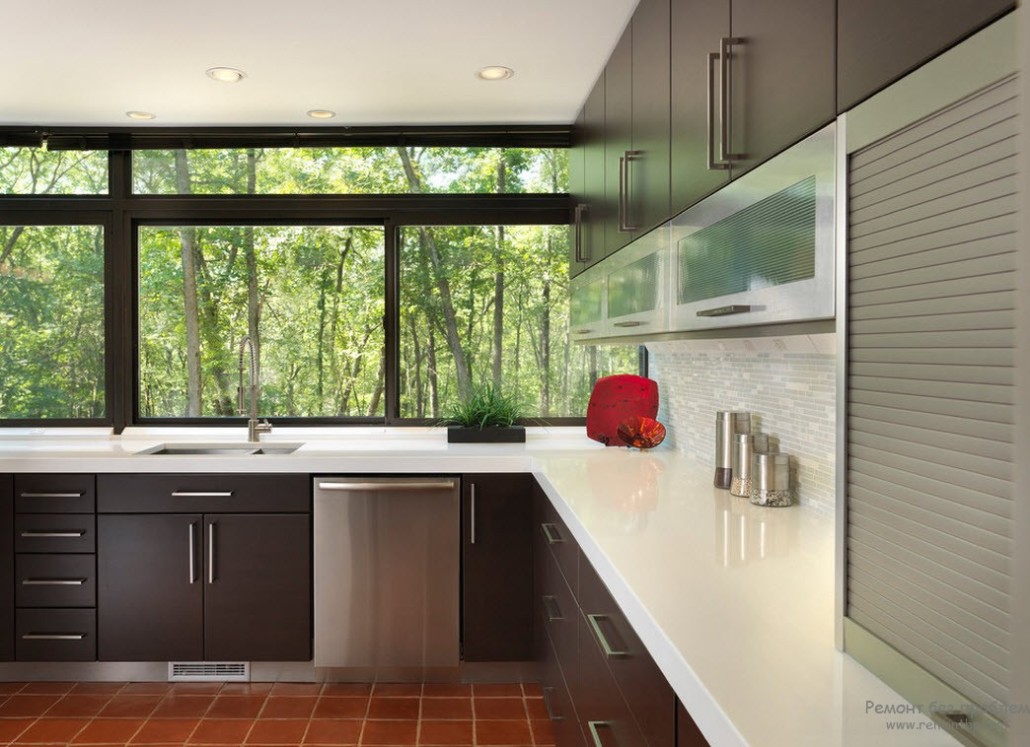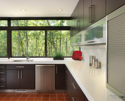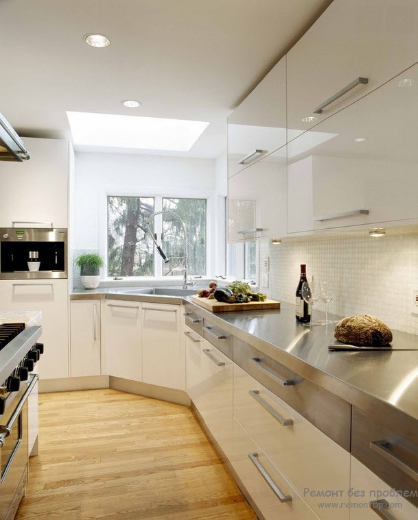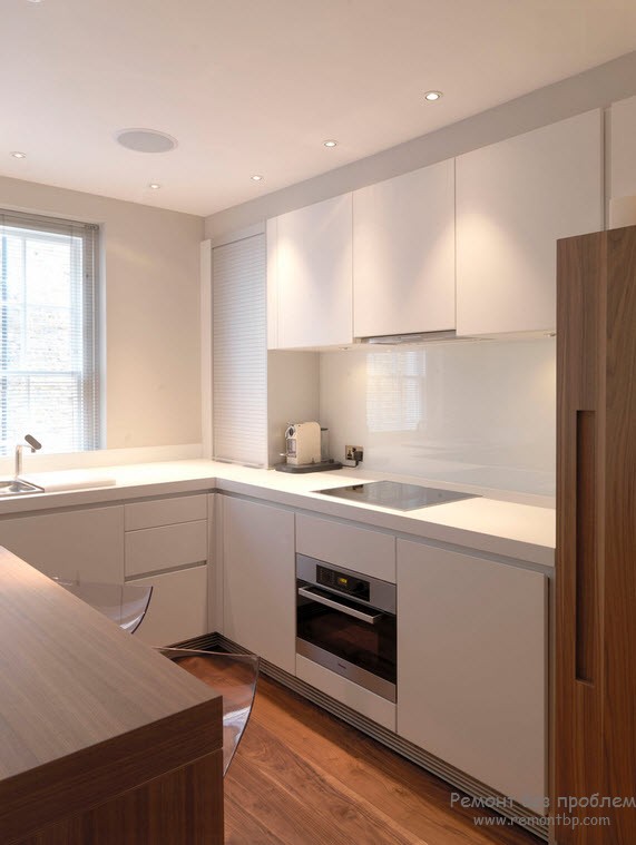 - С точки зрения композиции угловая кухня имеет преимущество над любым другим видом рабочей мебели.
