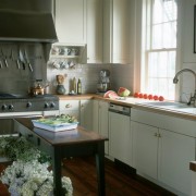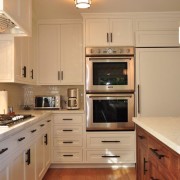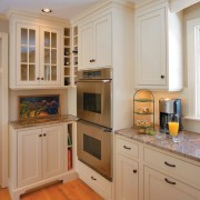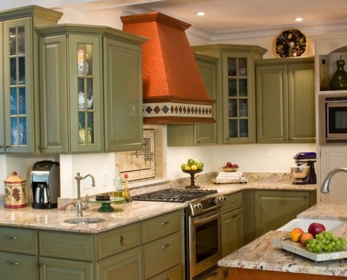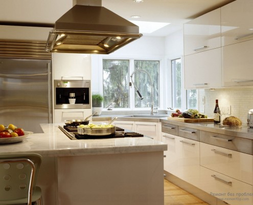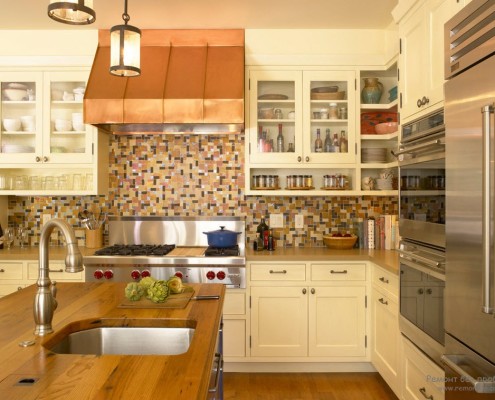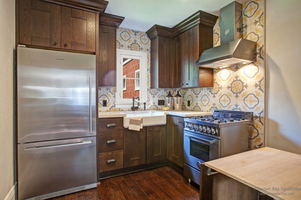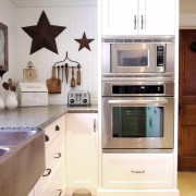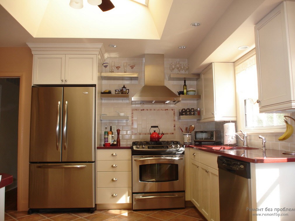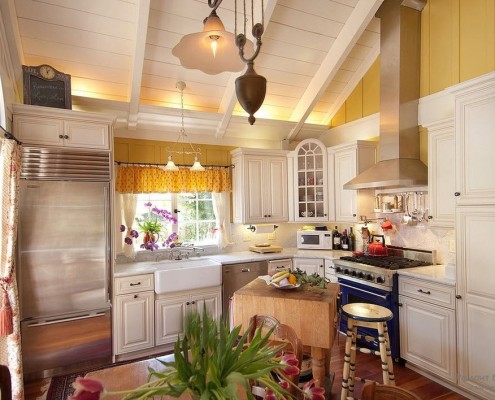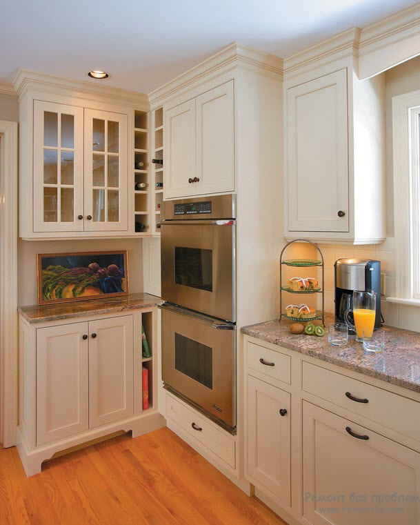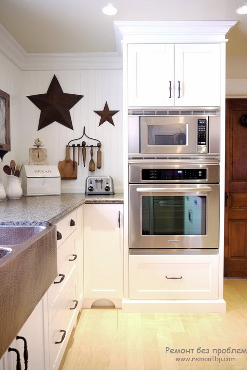 Стилизация – первый из вариантов применения бытовой техники чаще всего используется в современных интерпретациях классического стиля интерьера. Любой из бытовых приборов установленный в рабочей зоне кухни стилизуется под классический вариант подобного типа. Вытяжка оформляется в виде дымоотвода, плита в виде дровяной печи. Другие приборы, маскируются и устанавливаются в закрытые части купонного гарнитура.