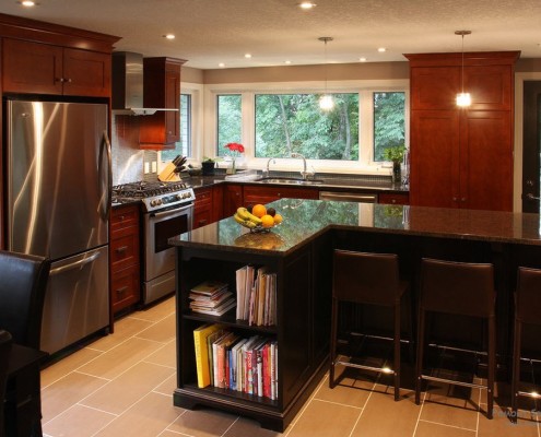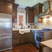 Неоклассицизм является самым распространенным стилем оформления кухонной мебели и предлагает использовать геометрические формы с мягкими углами, темные породы дерева и облегченный вариант декорирования. Фигурная резьба, аккуратная темная фурнитура и частичное остекление – единственные дополнения к мебели данного стиля.