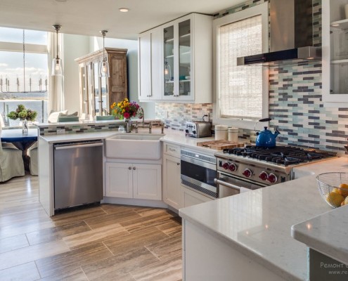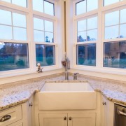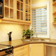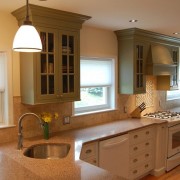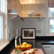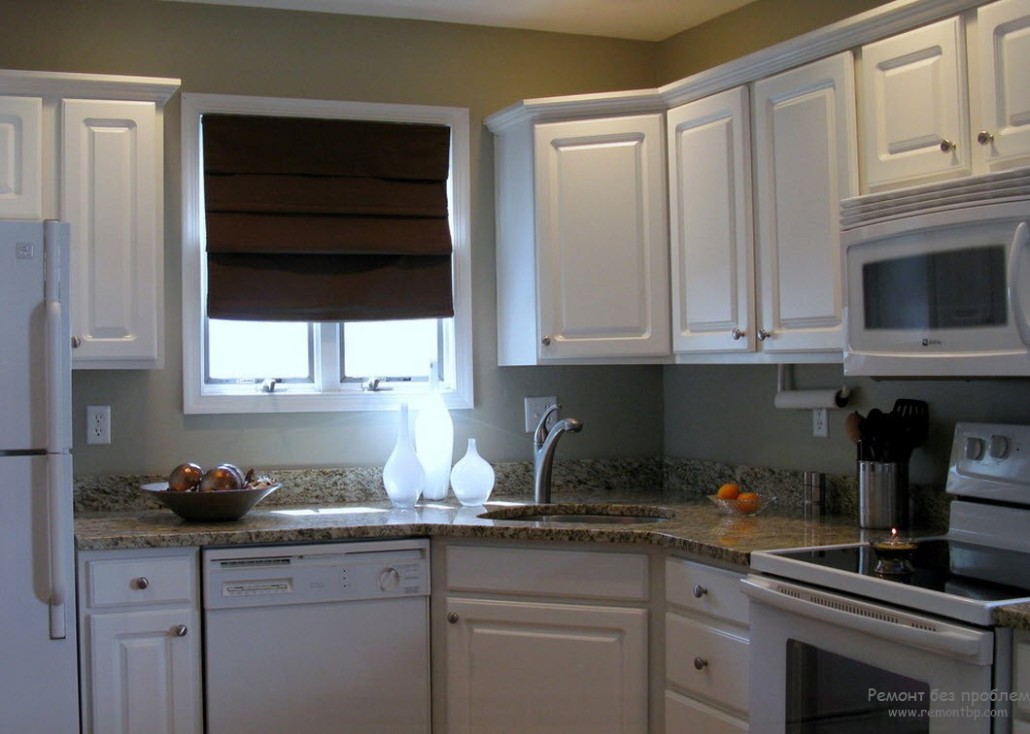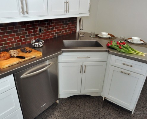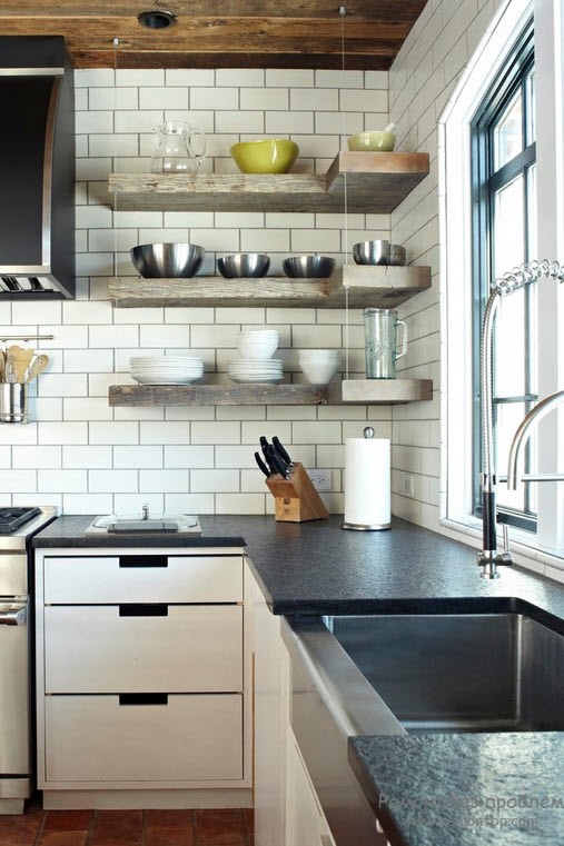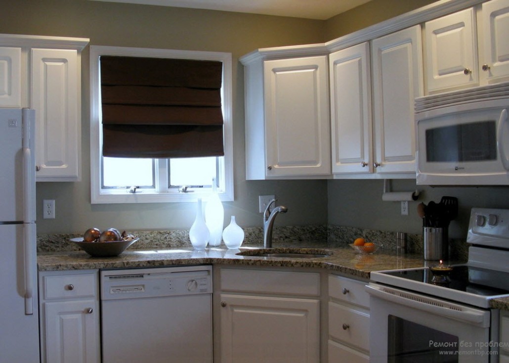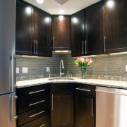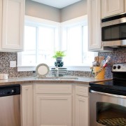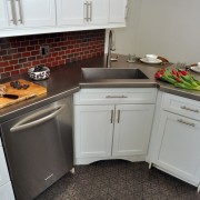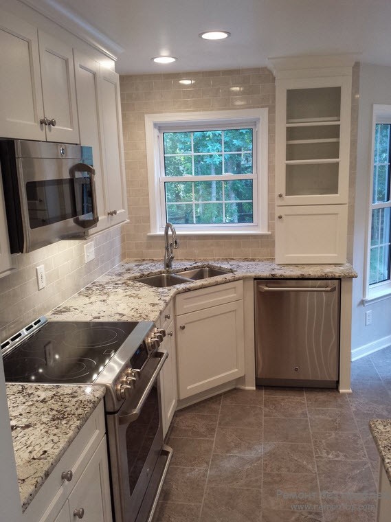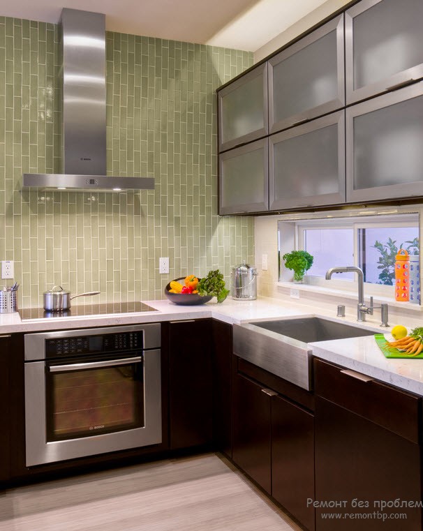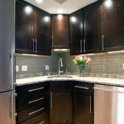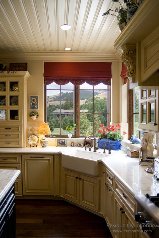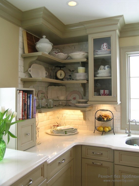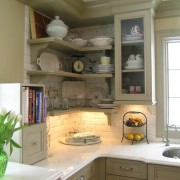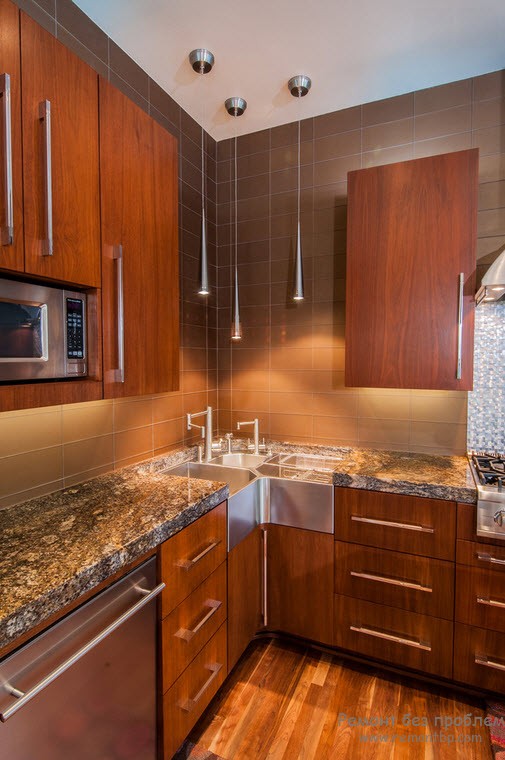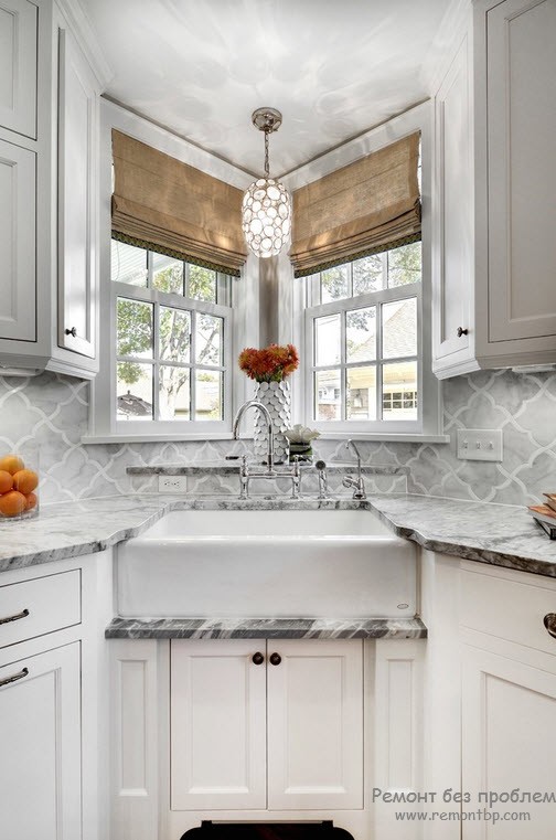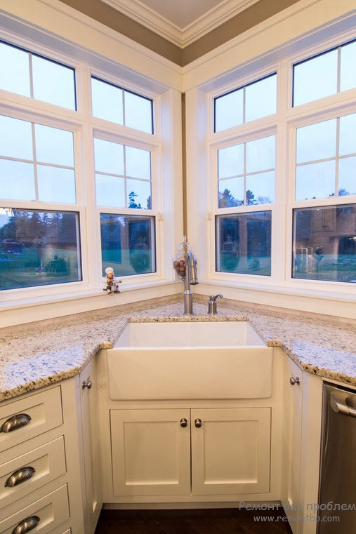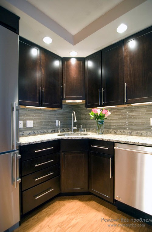 С эргономичной точки зрения мойка, расположенная в углу – не самый удобный вариант, в случае, если над мойкой есть шкафы. Преимущество угловой раковины – экономия места. Для более удобного расположения можно выбрать место для раковины близкое к углу, но с одной из сторон, прилегающих к стене.