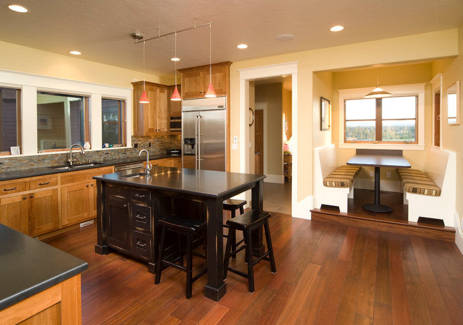- Самые лучшие способы расположения обеденной зоны возможны только при угловом комплекте кухонного гарнитура. Обеденная и рабочая зоны располагаются в противоположных концах кухни.