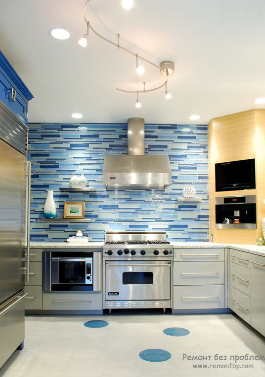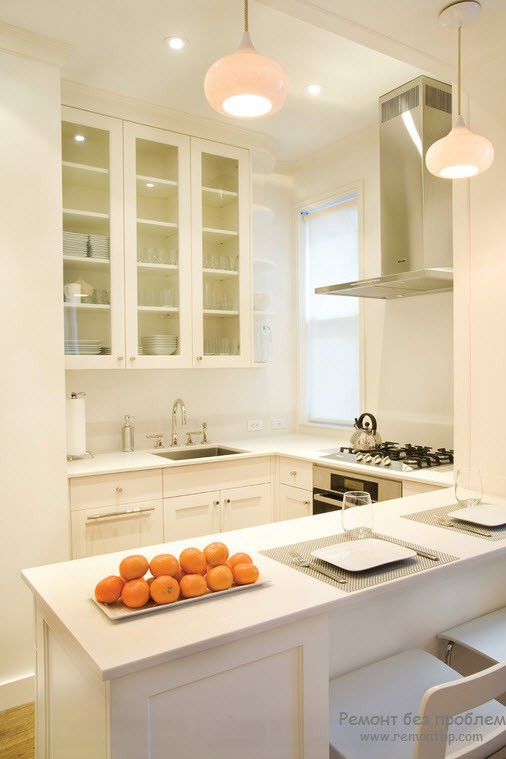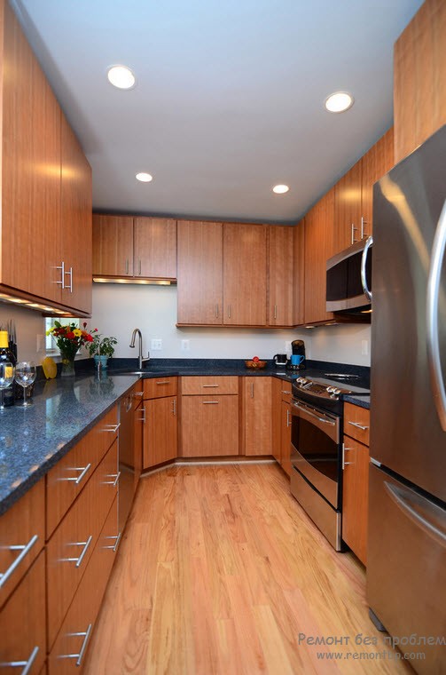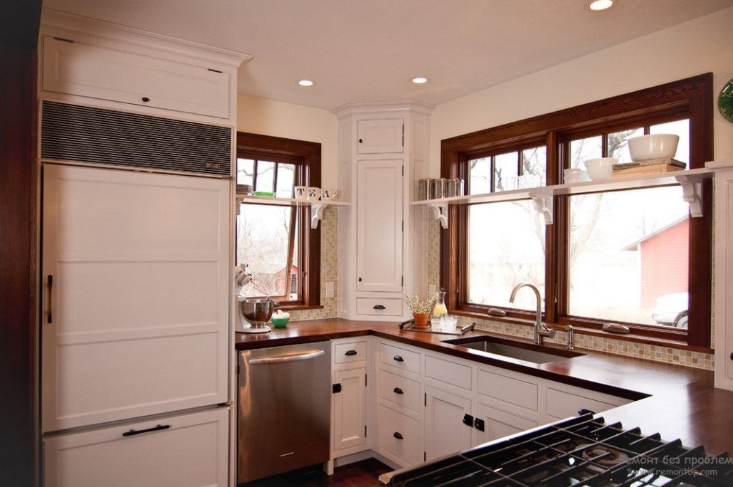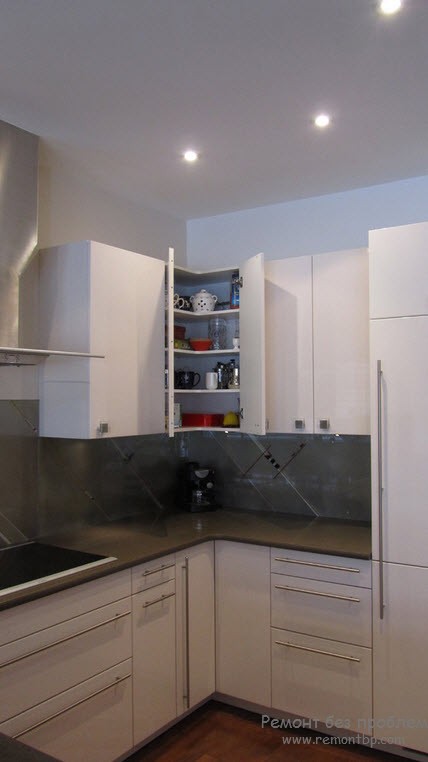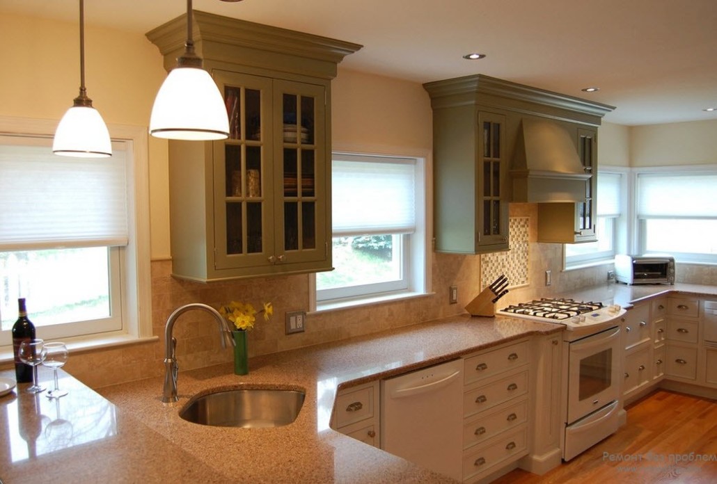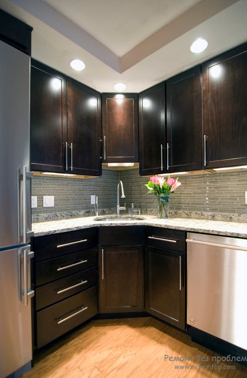 Расположение приборов освещения крайне важный и предметный подраздел, который учитывается при выборе стиля и конструкции угловой кухни. Учитывая, что гарнитур ориентирован в угол, освещение – это не столько дизайнерские требования, сколько необходимость, для обустройства комфорта.
