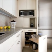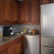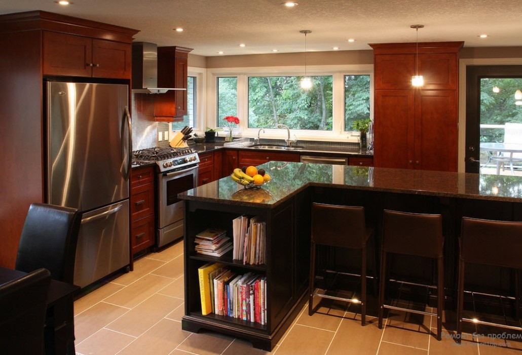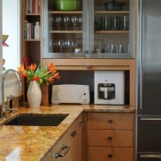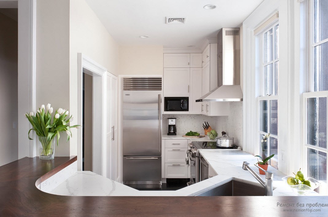 Холодильник, расположенный отдельно от угловой кухни используется реже. Недостаток такого вида сообщения между зоной хранения и двумя другими рабочими зонами кухни – это неудобство. К тому же холодильник расположенный отдельно занимает пространство зоны столовой, нарушая логику деления кухни. Однако, если такой вариант расположения неизбежен, цвет и форма холодильника выбирается с такими же требованиями, что и к крупным мебельным объектам, исходя из стиля интерьера.