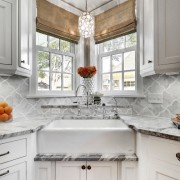 Романтизм – это легкость и изысканность, дополненная пластичными и элегантными мебельными формами. Основной материал – древо и белый мрамор, в контрасте с темными металлическими элементами фурнитуры. Простые мебельные конструкции, с мягкими декоративными линиями и аккуратными, но практичными столешницами. Предпочтение к молочному, белому, серому или бледно-розовому цветам. Остекление из рифленого полупрозрачного стекла выступает в виде дополнения, но основная часть навесных шкафов с глухими дверцами. Романтизм стремится подчеркнуть индивидуальность пространства за счет предметов быта, поэтому в декоре часто встречается посуда, столовые приборы и вазы с фруктами.