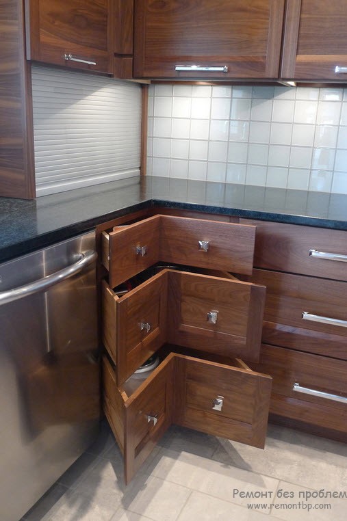 Если навесной шкаф расположен непосредственно над раковиной, то лучше выбрать модель мебели для кухни с выступающей угловой частью. Напольная тумба, предназначенная для раковины, что расположена с выносом вперед на 20-40 см. значительно удобнее в эксплуатации.