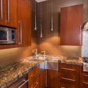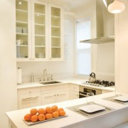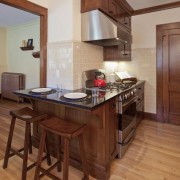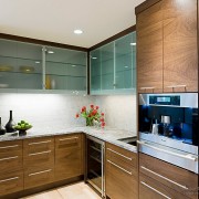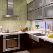 Арт-деко отдает предпочтение темным оттенкам холодных цветов и классическому сюжету. Угловая кухня, выполненная из дерева и окрашенная в темные или белесые цвета с обильным столярным декорированием и остеклением, может быть дополнена крупной металлической фурнитурой. Основное внимание на фактуру и контраст. Арт-деко – это стиль богемы, отличающийся исключительным достоинством и художественным сочетанием цвета.
