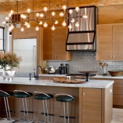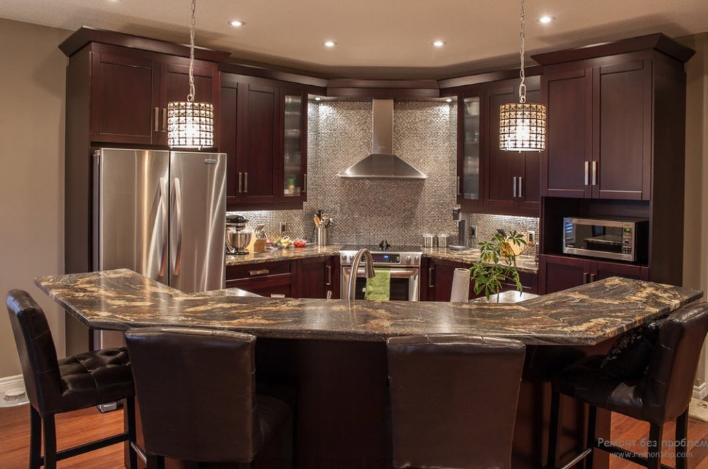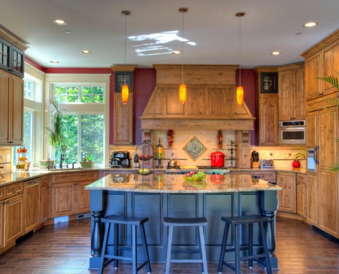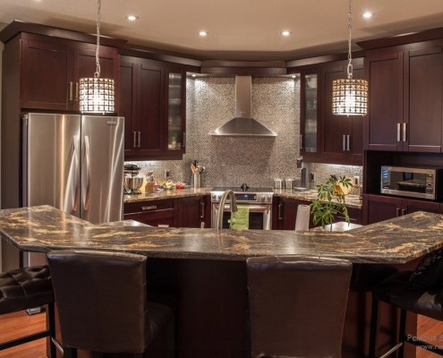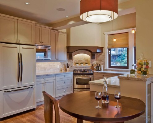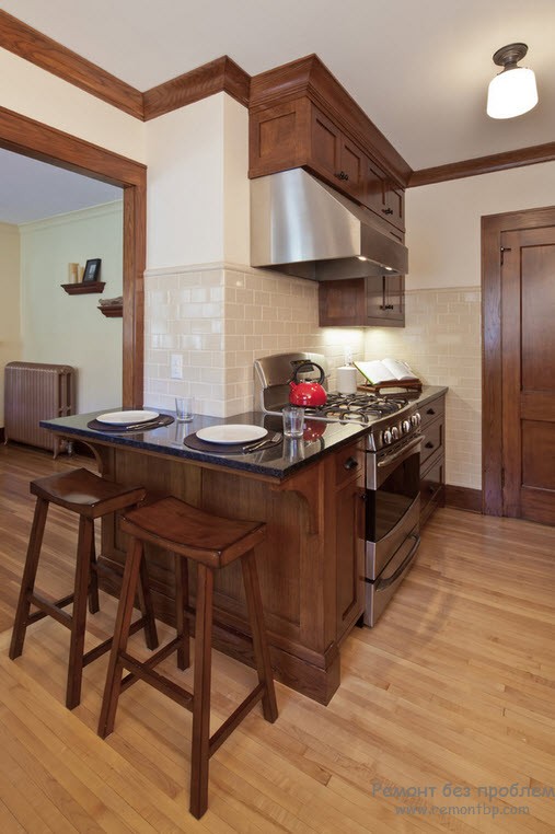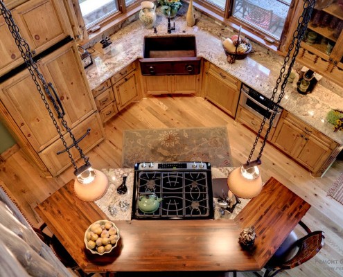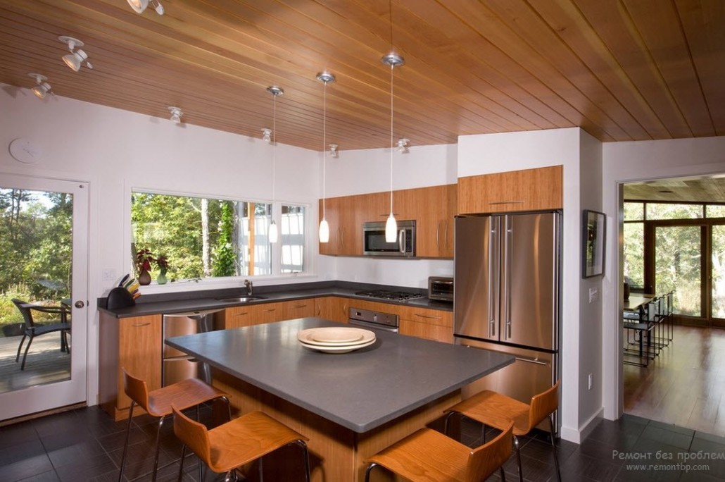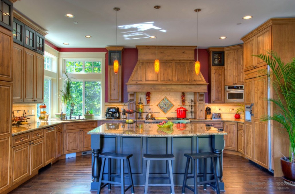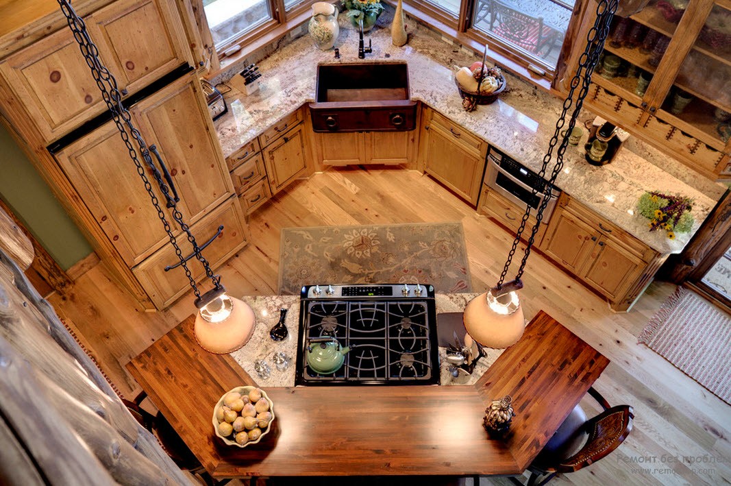 В интерьере шале используются исключительно природные материалы, основным из которых является дерево. Угловая кухня может быть выполнена в любом из древесных оттенков, значительно важнее форма. Простые горизонтальные и вертельные линии кухонной мебели подчеркиваются контрастом и фактурой природных материалов. Определяющей стиль особенностью, есть массивная столешница, выполненная из натурального камня или дерева.