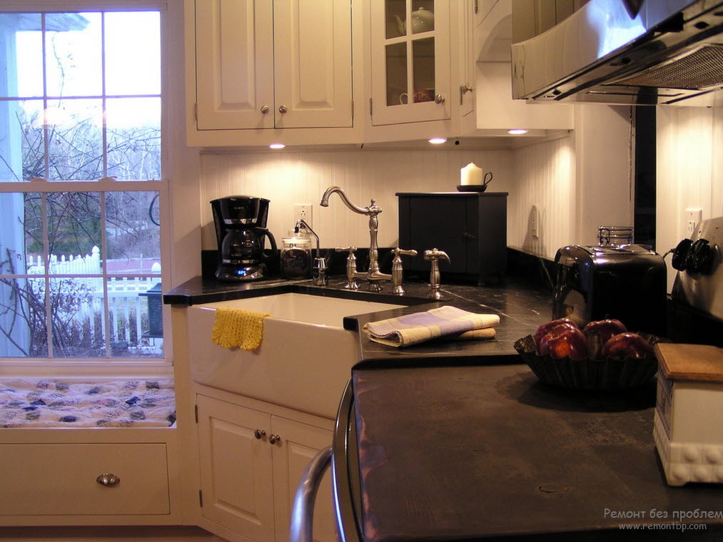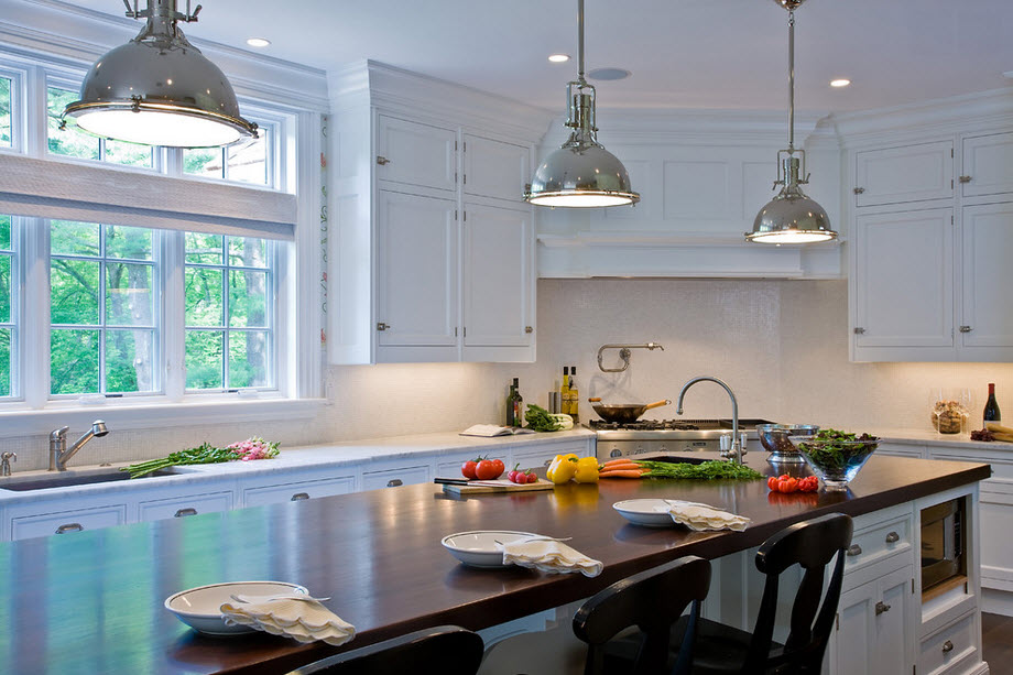 В традициях классических кухонных гарнитуров, дополнительного освещения не предусматривается. Все пространство кухни освещается с помощью центральных осветительных приборов. Важно подчеркнуть, что соответствие традиционным классическим канонам не означает обустройства жилого помещения, на уровне комфорта прошлых столетий. Композиция, цвета, формы и интерьер в целом не препятствует использованию современных способов освещения. Для сохранения стилистики лучше использовать скрытое освещение, расположенное под навесными шкафами и полноценно освещающее рабочую зону.