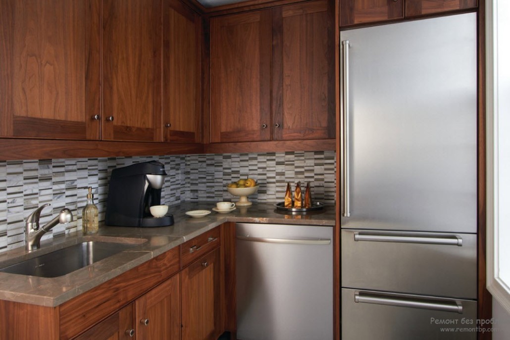 В случае если холодильник выступает частью угловой кухни, продолжая ряд мебели, его цвет и форма должны полностью соответствовать геометрии гарнитура.