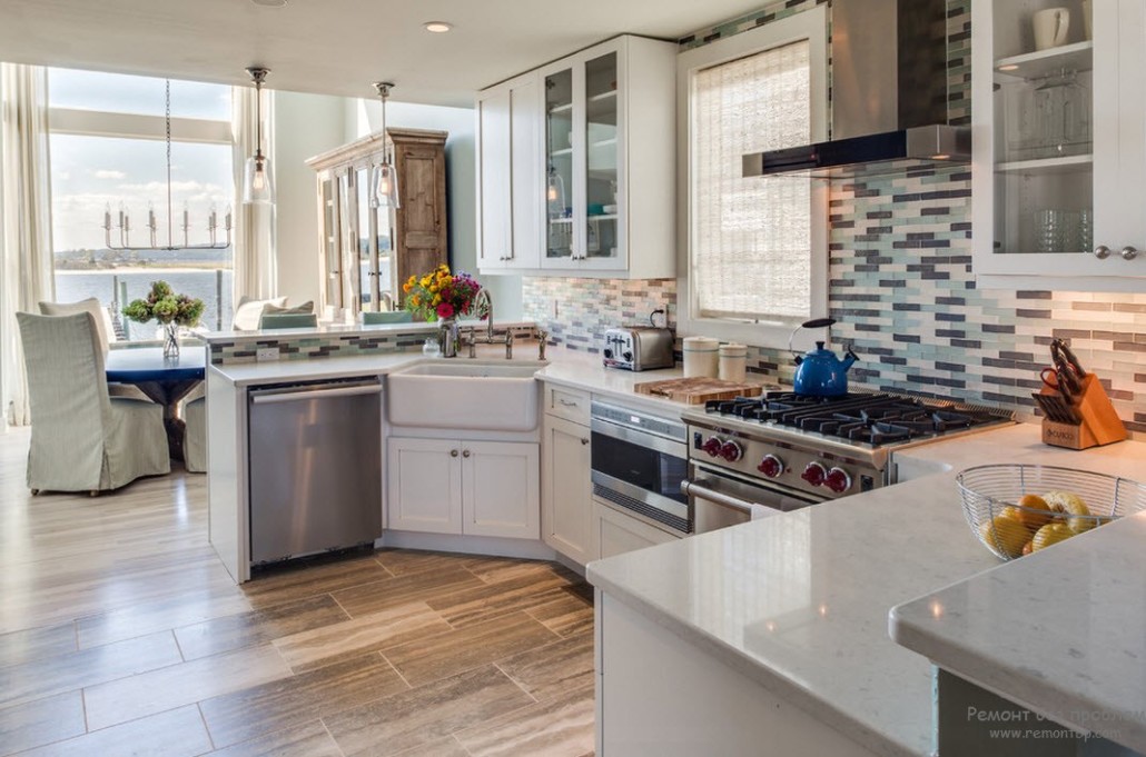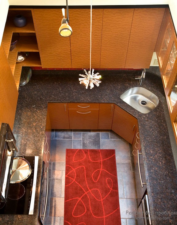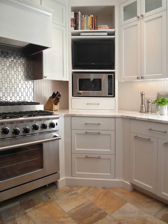 Рабочая зона на кухне организовывается таким образом, что бы образовать треугольник между зоной хранения, мойкой и зоной приготовления. Поскольку речь идет об угловой кухне, то создать треугольное расположение значительно проще.
