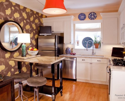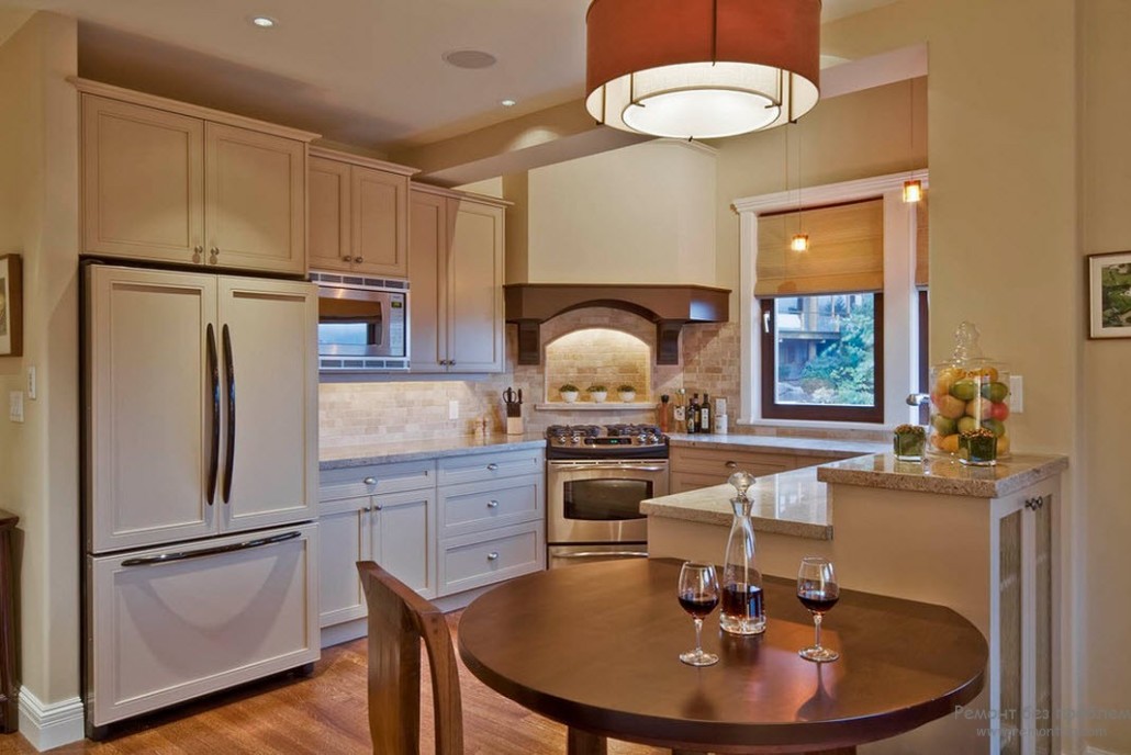 Заключительный вариант сочетания – коррекция или модификация стиля. Классический стиль, учитывая все требования к геометрии помещения, цветовым гаммам и материалам, сочетается с современным стилем интерьера, расположенным к использованию техники. Данный вариант можно выполнить с помощью разделения пространства, где в одной зоне обустраивается современный интерьер с бытовой техникой, а в другой – исключительно классический. Так же можно модифицировать стиль, заменив один из материалов на металл или пластик (соответствующий по цвету основным материалам выбранного классического стиля). В таком случае бытовая техника не будет выделяться из общей композиции.