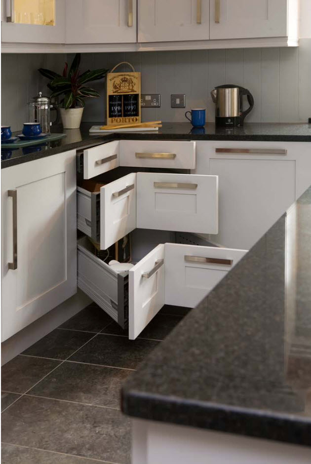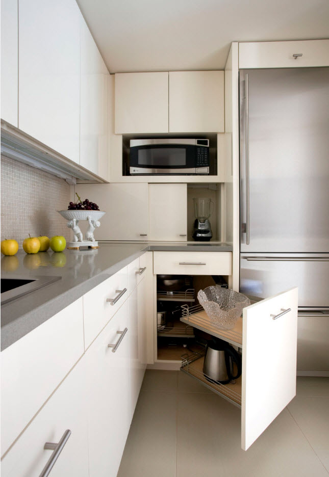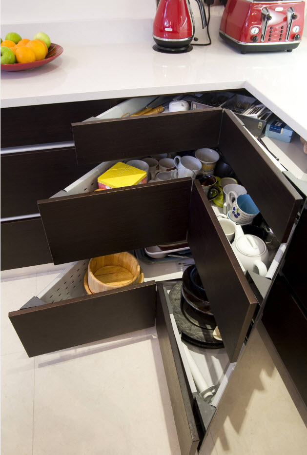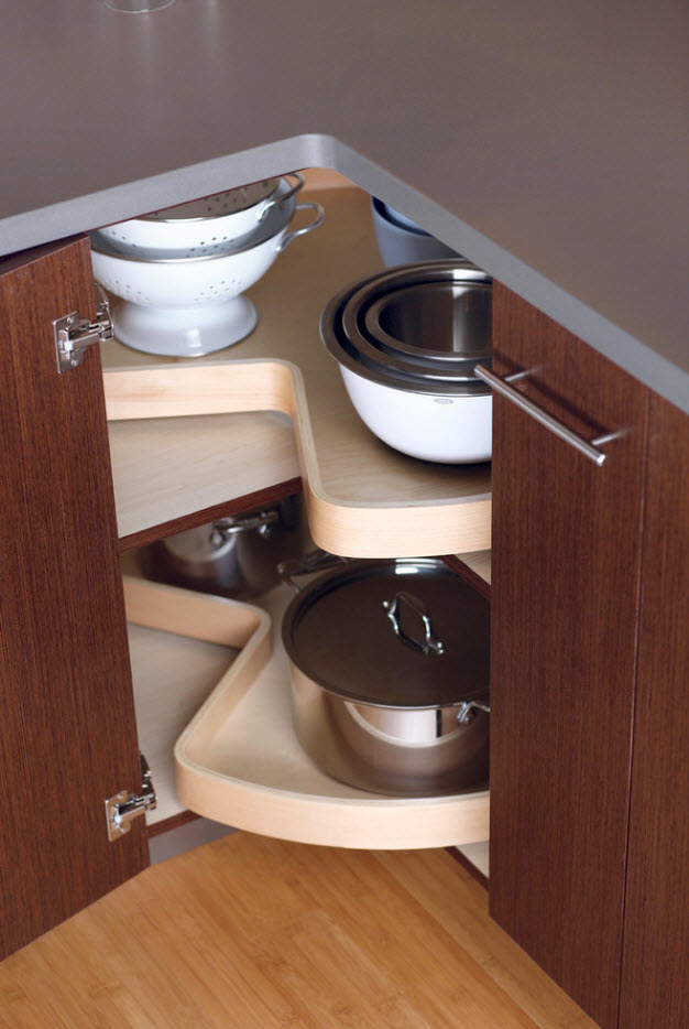 Если угол мебельного гарнитура составляется из двух систем хранения, то проблематичным становится простота в эксплуатации подобных шкафов. Ведь содержимое таких систем хранения будет располагаться довольно глубоко в углу помещения. Для облегчения использования угловых шкафов, производители мебели придумали немало вариантов выкатных и поворотных полочек. В зависимости от того, какого формата кухонная утварь будет храниться в шкафах, можно выбрать разные варианты