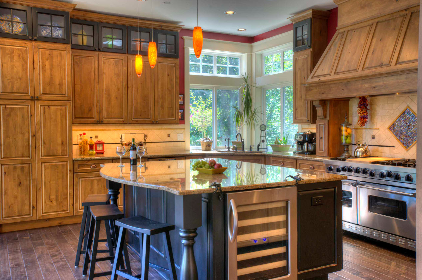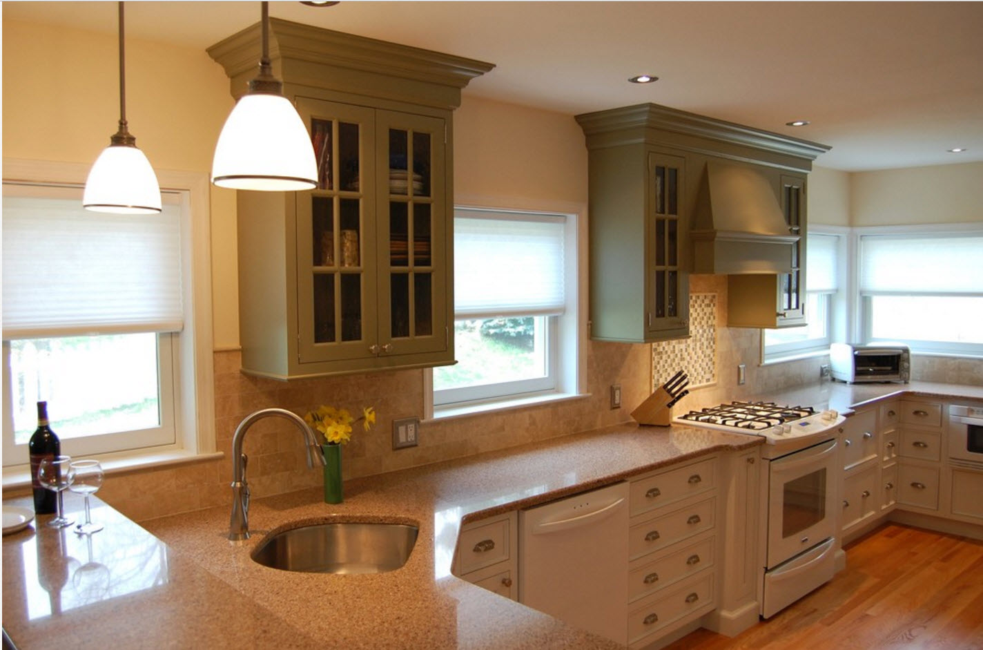 Если один из углов кухонного помещения составлен оконными проемами (такой вариант чаще встречается в частных домах, реже – в квартирах новой планировки), то логичнее всего было расположить в этой зоне раковину. Мойка у окна – мечта многих хозяек. Рутинные кухонные процессы гораздо приятнее выполнять, имея возможность любоваться красивым видом из окна. Да и уровень естественной освещенности в этом случае максимальный, что не может не сказаться благотворно на качестве мытья посуды и выполнения других рабочих процессов.