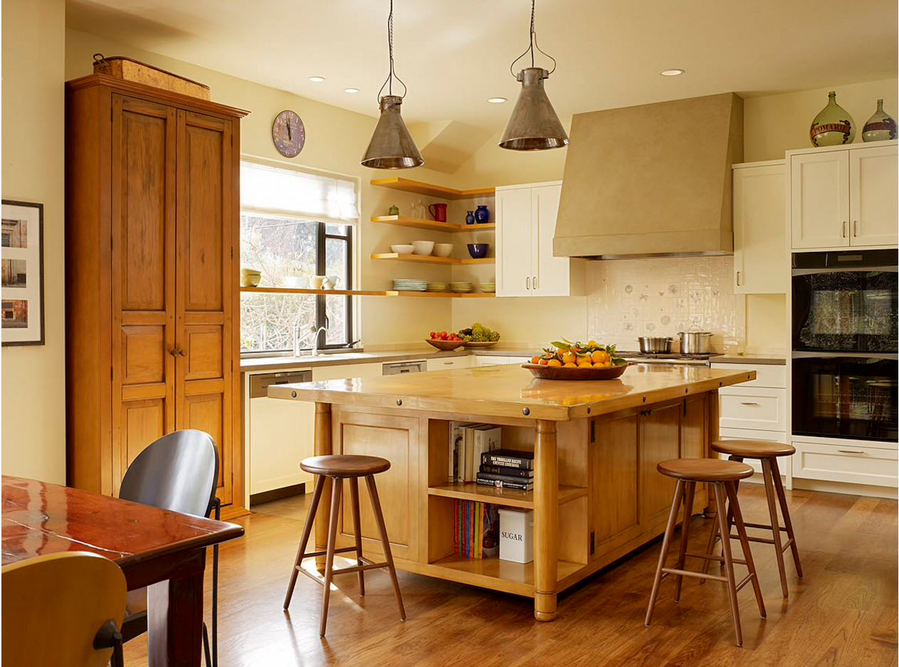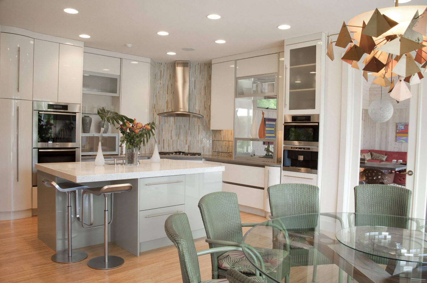 В зарубежных дизайн-проектах кухонных помещений использование кухонного острова невероятно популярно. Наши соотечественники тоже приобщаются к этой тенденции и на личном опыте ощущают преимущества от применения отдельно стоящего модуля, который может служить дополнительной системой хранения, местом для интеграции бытовых приборов, установки раковины, варочной панели. Но в контексте нашей темы, кухонный остров интересует нас, прежде всего, в качестве модуля для организации места для трапез. Для этих целей столешница кухонного острова может быть продлена как с одной стороны (посадочные места для двоих членов семьи), так и на углу модуля (усадить можно уже 3-4 человека, в зависимости от размеров столешницы).