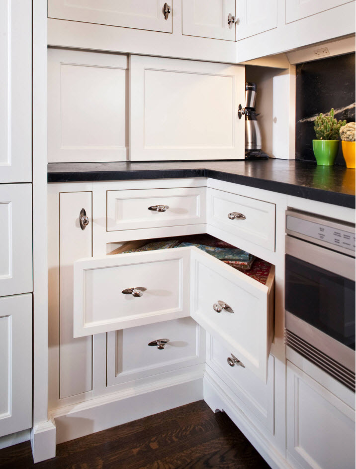 И в готовых мебельных решениях для кухни, и в гарнитурах, изготовленных на заказ, можно увидеть следующий вариант организации систем хранения в углу помещения кухни. Между верхним и нижним ярусом шкафов нет пространства, его занимают выдвижные ящики или распашные дверцы системы хранения, чаще всего выполненной в форме пятиугольника (реже такие шкафы имеют полукруглый фасад).