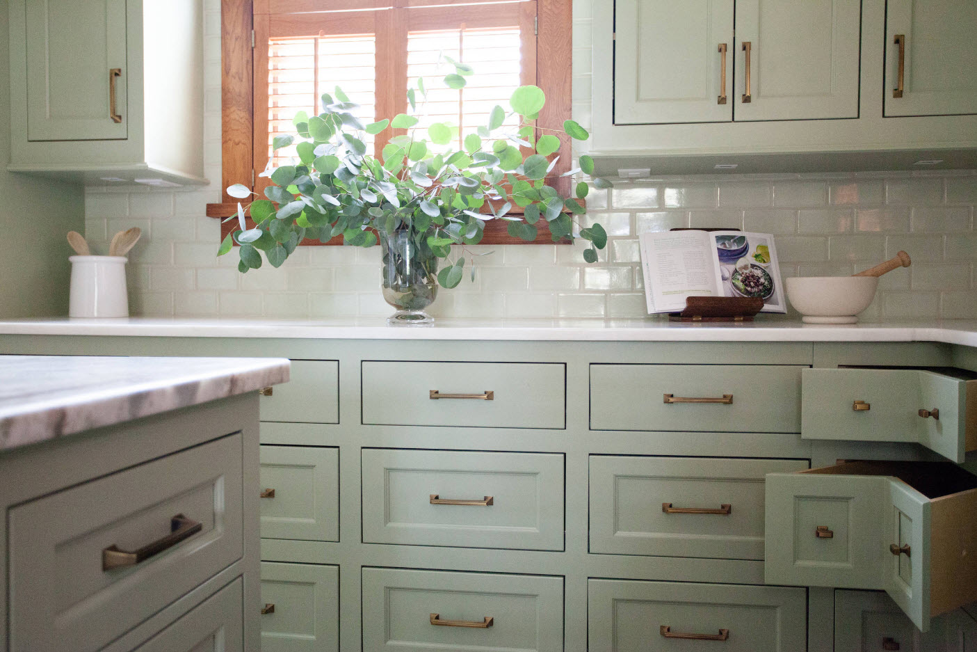 Один из вариантов исполнения фасада угловой системы хранения – выдвижные ящики, облицовка которых имитирует угол. Такой подход позволяет не только сохранить образ углового гарнитура, но и не потратить ни одного лишнего сантиметра свободного пространства кухни. Для систем хранения это несет небольшие потери в плане вместимости.