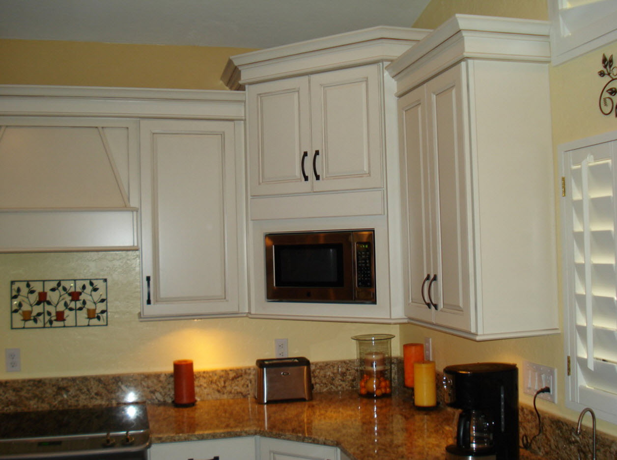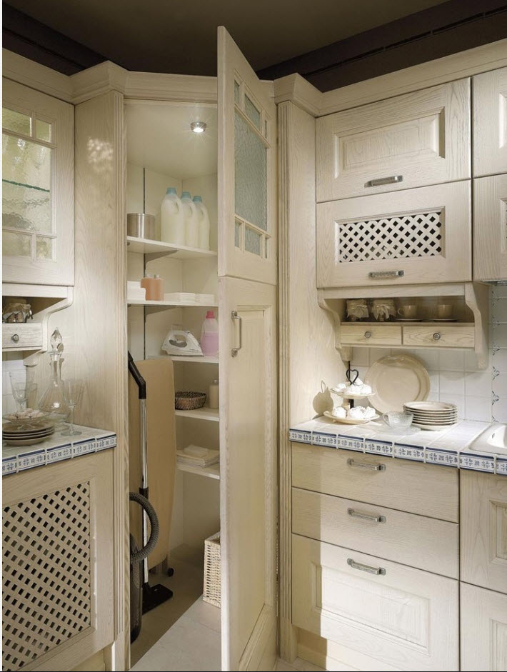 В некоторых случаях целесообразным будет использование углового шкафа (на всю высоту мебельного гарнитура) для эффективного использования угла помещения. Но такой вариант расположения систем хранения подходит для кухонных помещений средних и больших размеров. Тогда и прерывание столешниц на установку вместительного шкафа-пенала не будет критичным и слегка «обрезанная» оставшаяся после установки гарнитура площадь будет достаточной для установки обеденной группы, острова или полуострова со столешницей для трапез.