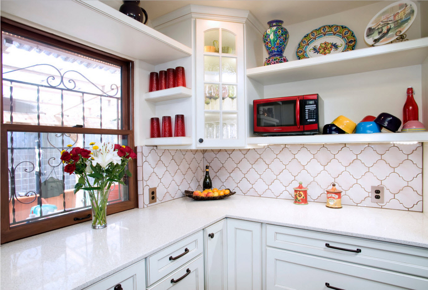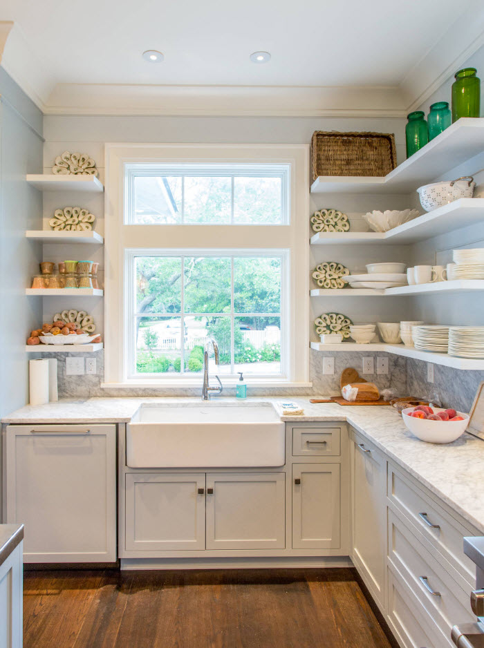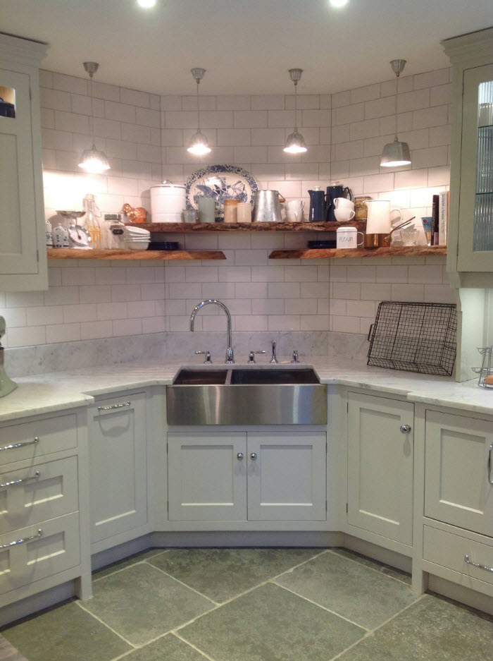 Если говорить об организации систем хранения в углу кухни на верхнем ярусе, то наиболее простой и при этом оригинальный способ исполнения – навешивание открытых полок. Такие полки изготавливаются в угловом исполнении и позволяют эффективно использовать непростую зону помещения. К тому же, открытые полки позволяют «разбавить» монолитность верхнего яруса кухонных шкафов, привнести разнообразие в оформление фасадов мебельного гарнитура.